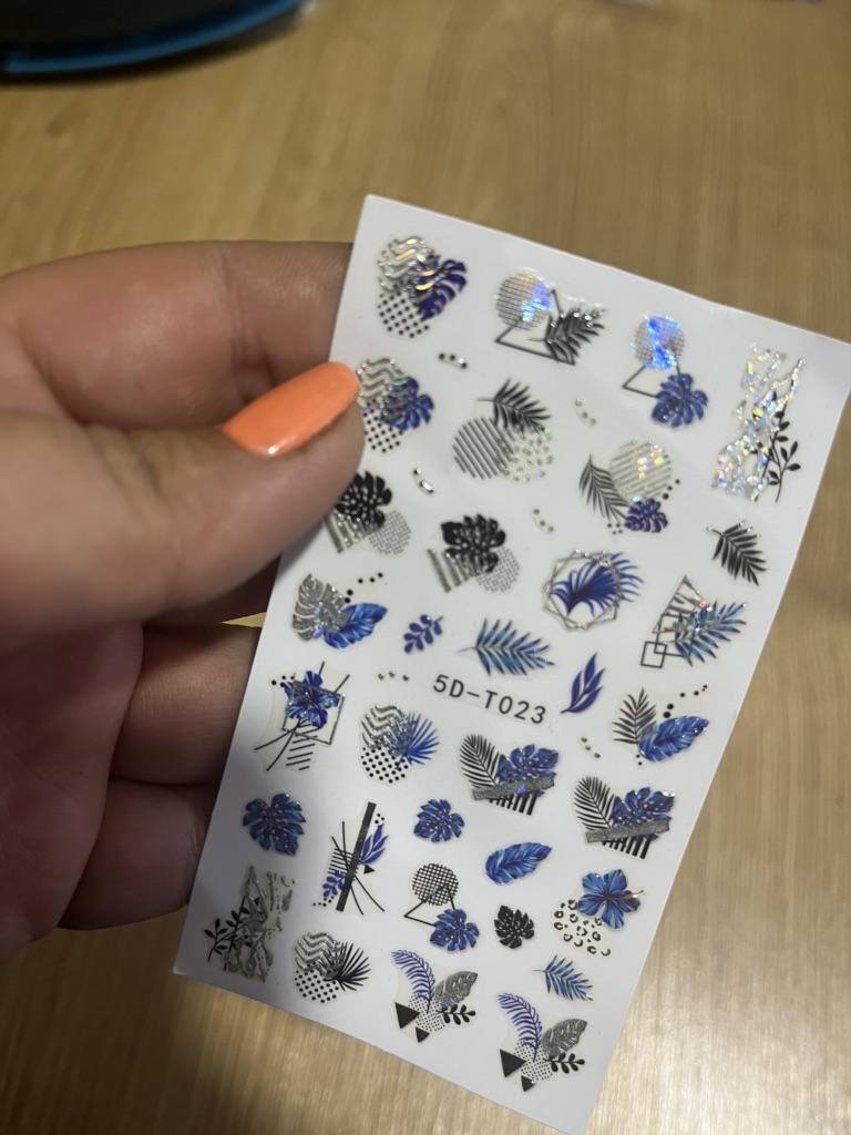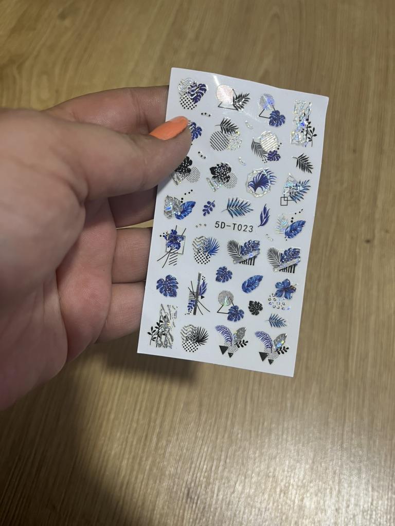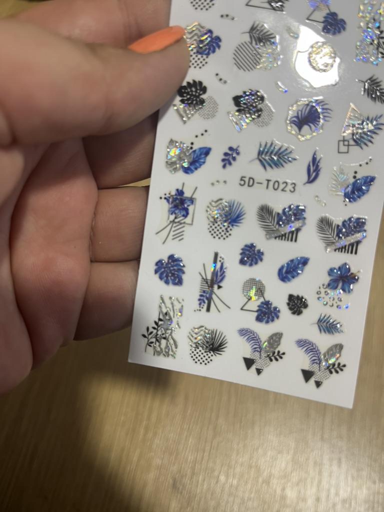 Stickers for nail art 💅🌿💙 The seller has about two dozen different drawings, each interesting in its own way. I chose blue leaves with silver. I definitely don't have those yet.☺️ The stickers are voluminous. The picture is clear. Everything is as in the promo photo. I should note that I always cover such stickers with a top. Everything wears great. A little secret to make a manicure with stickers last longer - the sticker should not go beyond the edge of the coating and completely overlap with the top. Well, at least that's how I do it 😉 The stickers are cool. I recommend 🛒. I received the product in 32 days in a combined package 🚚 (I ordered two products in one store, the seller put everything in one envelope.) The track was tracked completely . The arrival at the delivery point was notified by sms 📳. Packaging: bubble envelope and individual packaging. Goods without defects and defects, without foreign odor. If the information was useful, put it as a favorite ❤️😘 Happy shopping and fast deliveries to everyone 🛍️☺️✈️🌿 And remember that every woman is a star, so shine brighter 🌟. PS: I invite everyone who is interested in promo codes for 10-15% to my Telegram channel: Olena.joom.thebest 🎁💙