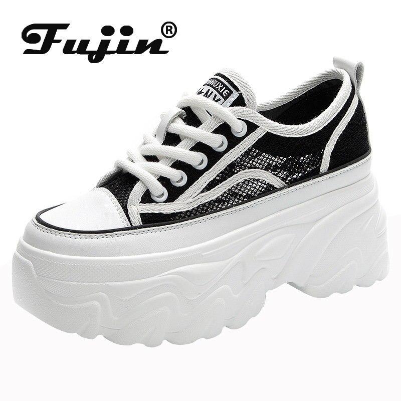 Fujin 9cm New Air Mesh Hollow Genuine Leather Platform Women Fashion Chunky Sneakers Breathable Summer Hidden Heels Casual Shoes