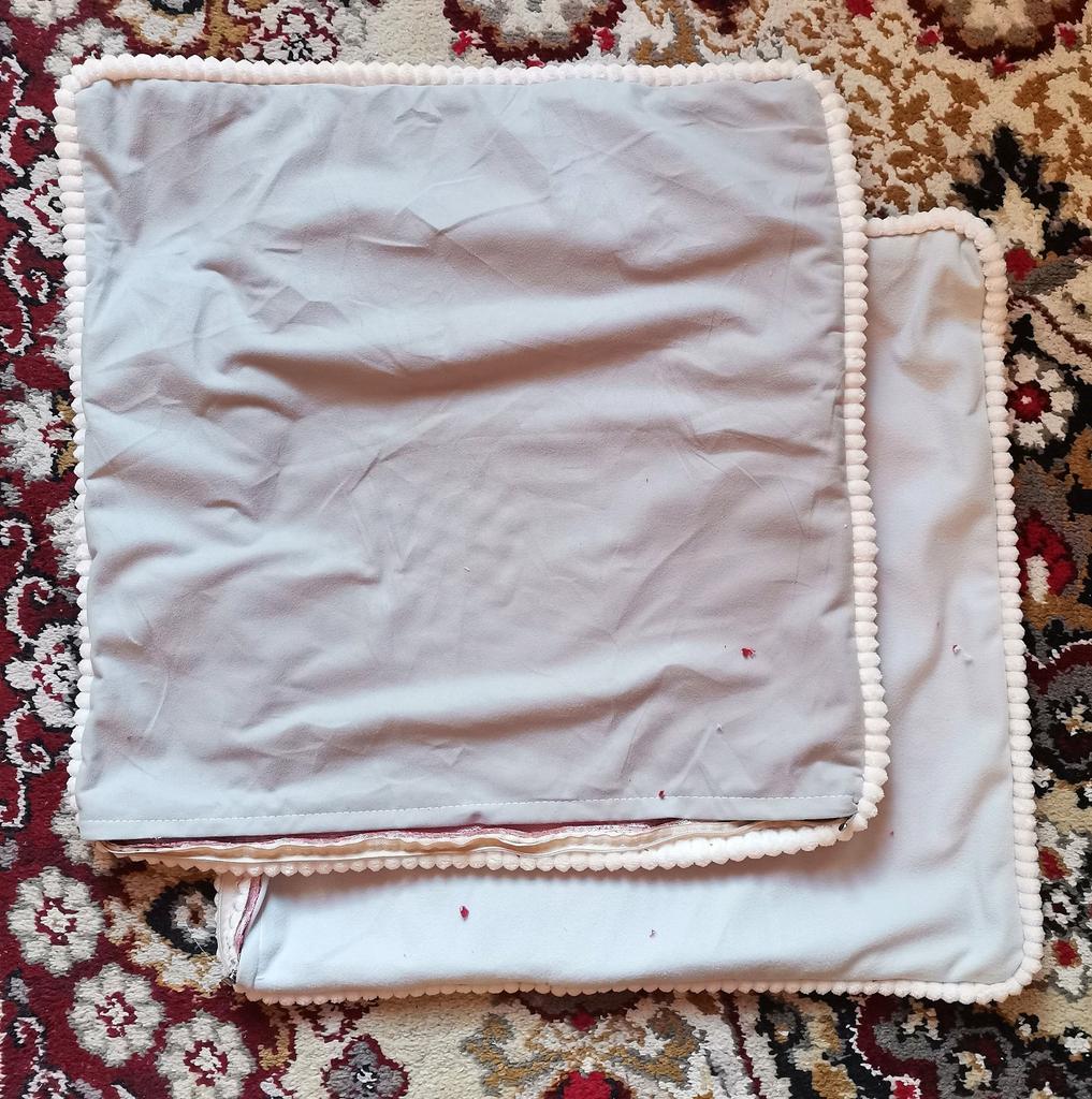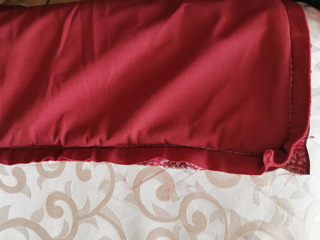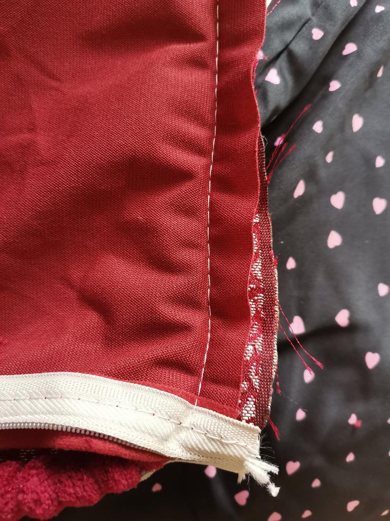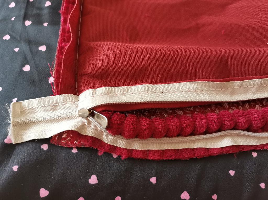 The pillowcase is 49 by 49 cm. It is too big for my pillows. 🤔They should be 45#45. I wanted to wash it and what did I see in them... A disaster 😳😵🙈 Bordeaux fabric sewn with white threads.. White - grey zipper sewn on. Gigantic sewing stitch up to 6mm. Wrinkles everywhere and too much leftover fabric, which must be removed. The rubbish from the velvet and silk runs out because the fabrics are not treated with overlock or zig-zag. 😭 Now everywhere in the room.
