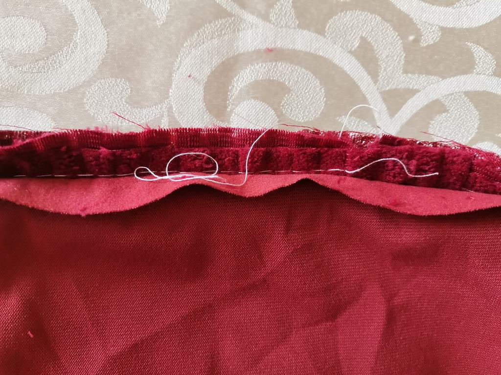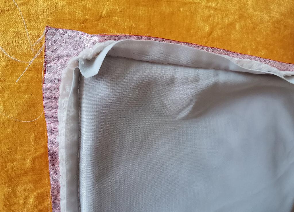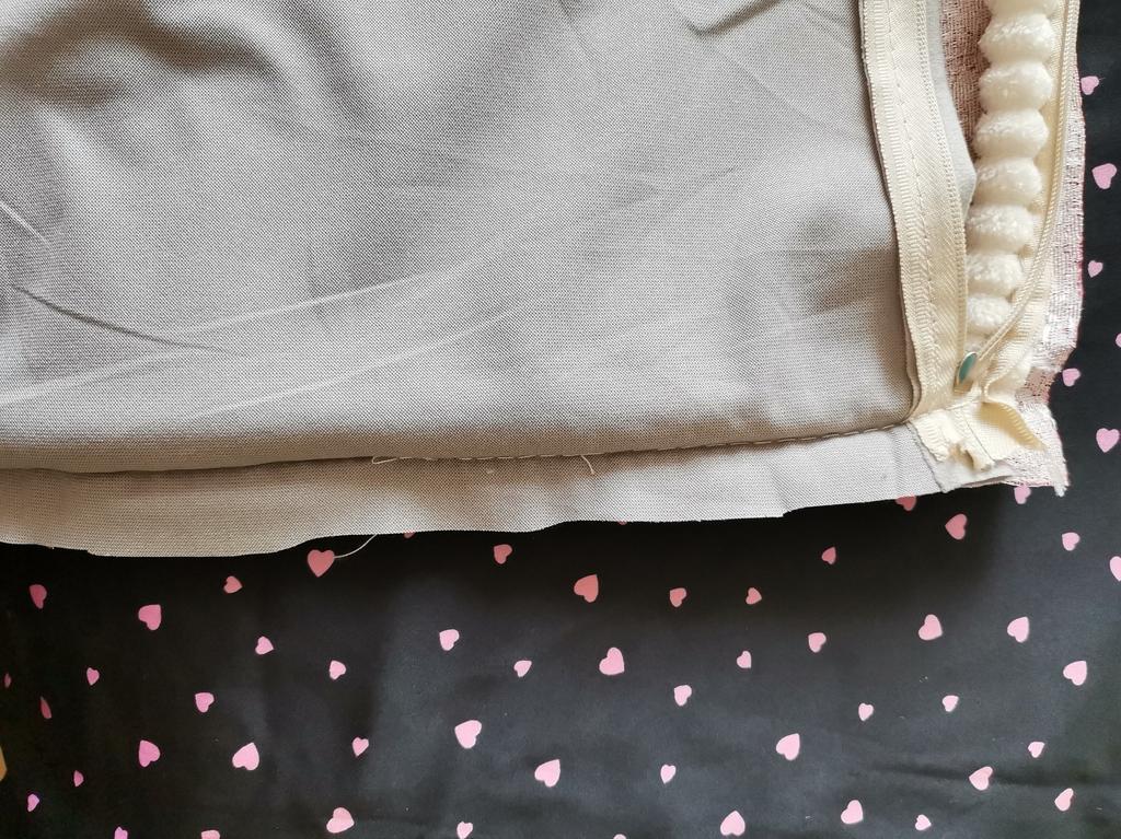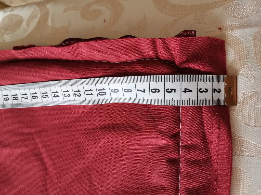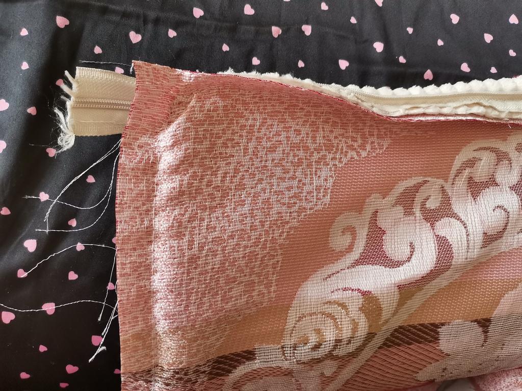 The pillowcase is 49 by 49 cm. It is too big for my pillows. 🤔They should be 45#45. I wanted to wash it and what did I see in them... A disaster 😳😵🙈 Bordeaux fabric sewn with white threads.. White - grey zipper sewn on. Gigantic sewing stitch up to 6mm. Wrinkles everywhere and too much leftover fabric, which must be removed. The rubbish from the velvet and silk runs out because the fabrics are not treated with overlock or zig-zag. 😭 Now everywhere in the room.