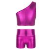 Kids Girls Metallic Single Shoulder Crop Top with High Waist Shorts for Sports Gymnastics Workout
