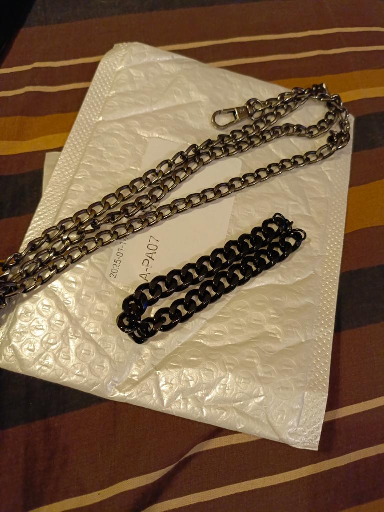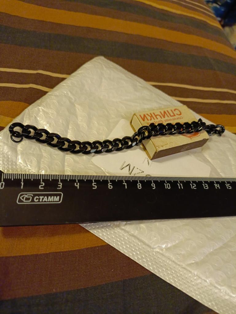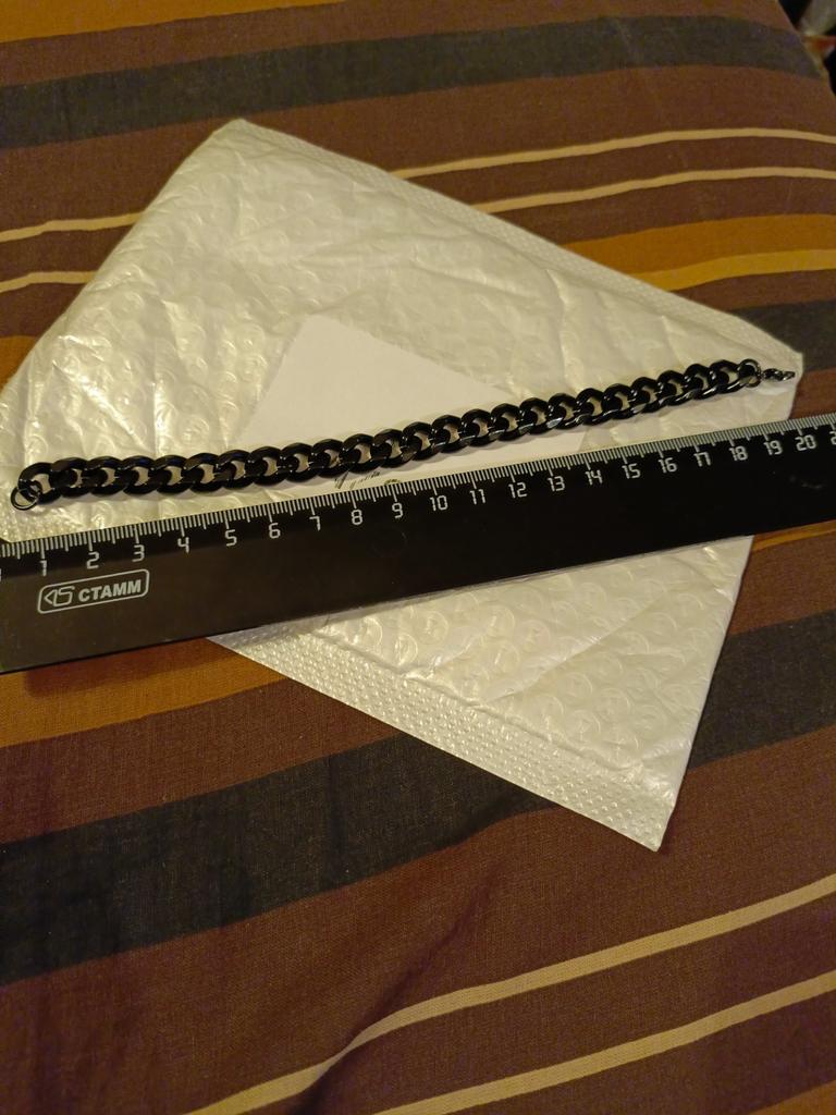 21 cm with a small carabiner (can a man handle it?) Good, glossy, for a lover of black, link width approx. 10 mm.