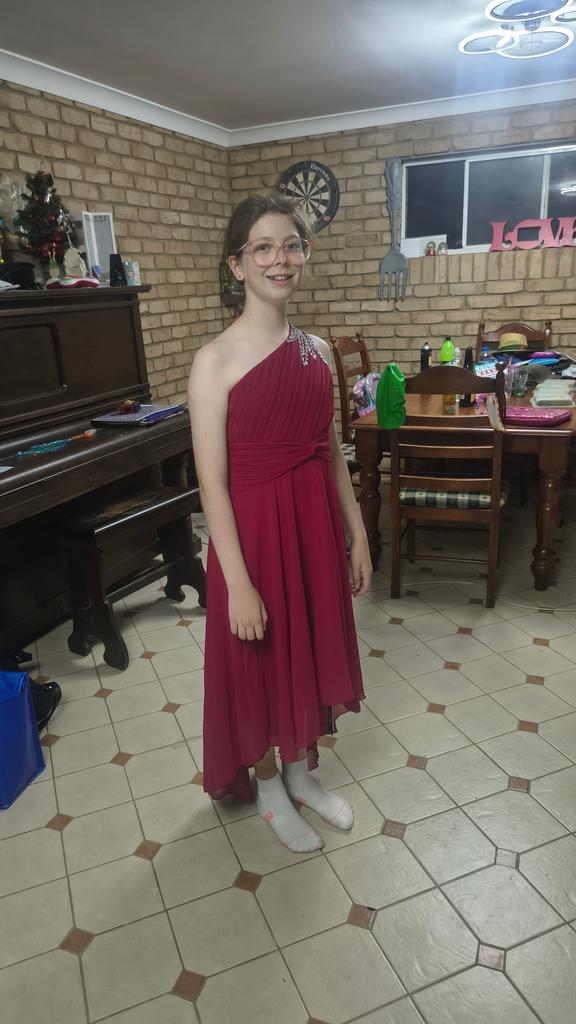 True to size. My daughter is stuck between sizes au girls 12 and 14 at 12 years old.the 13-14 fits nice may need a small clip on the back to bring it in a little. But if your child is bustier you won't have this problem. Highly recommend this dress is stunning