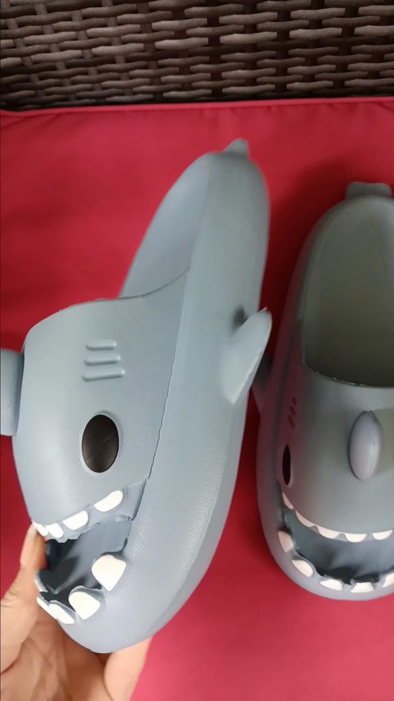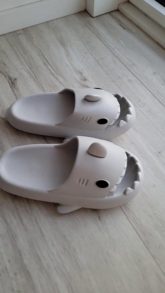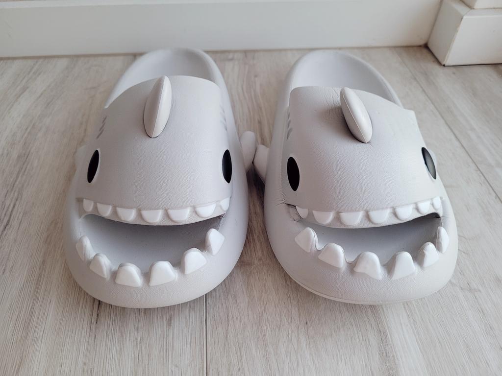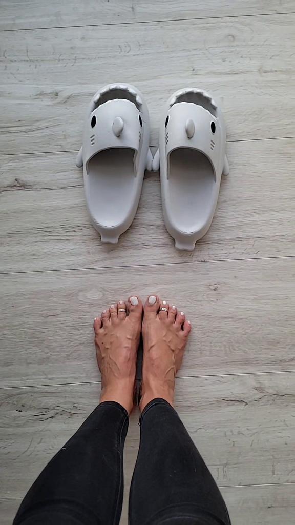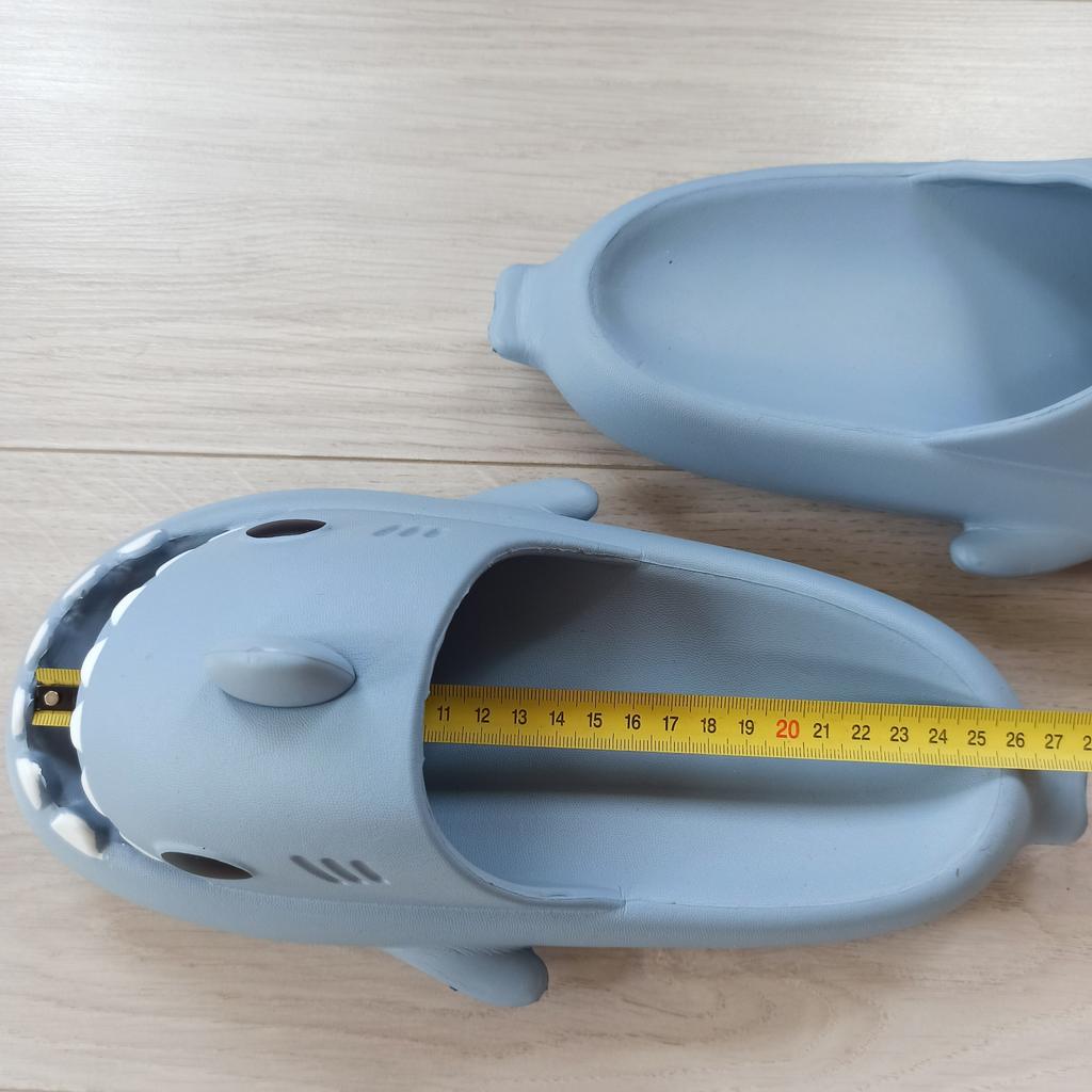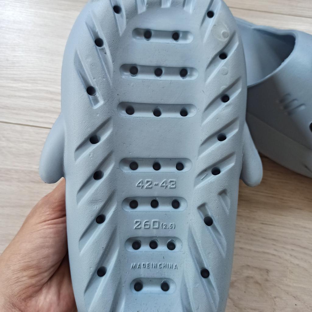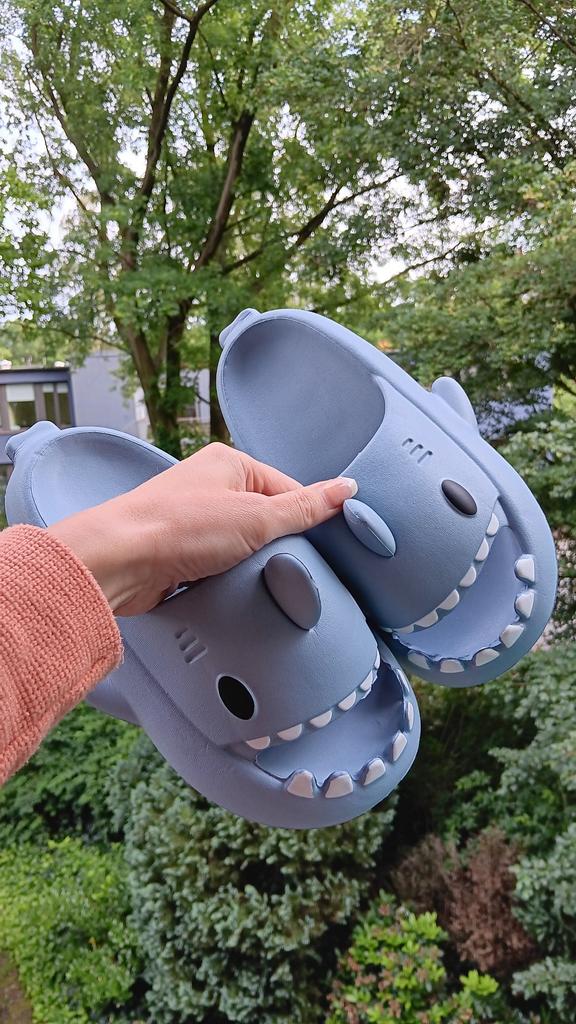 * Slippers in a shark look 🦈 * 💥𝗟𝗶𝗲𝗳𝗲𝗿𝘇𝗲𝗶𝘁 11 Take 💥𝗟𝗶𝗲𝗳𝗲𝗿𝘂𝗺𝗳𝗮𝗻𝗴 Comes with a pair of matching color and size slippers. They are available in 7 different colors in sizes 36-45 . I ordered slippers in sizes 42 to 43 in grey. I'm usually shoe size 40, I still have a little air in my shoes. I used the manufacturer's centimeters as a guide. I think 1 size smaller would have been a good fit. I would say the fit is more suited to a wide footbed. Not for narrow feet. 💥𝗤𝘂𝗮𝗹𝗶𝘁ä𝘁 The shoes are very comfortable. We have a pleasant soft footbed, which gives well. It's some kind of rubber/foam mix I think. The shoes don't pinch... They are ideal as flip-flops or slippers They don't smell like chemicals. I especially like the shark look. 🦈 For material composition : Unknown 💥𝗙𝗮𝘇𝗶𝘁 Very cute shark-look slippers that are perfect as flip-flops... you can order your original shoe size. 👌 The shoes are more suitable for a wide footbed. ‼️ A small disadvantage is that you could possibly stumble through the side fins, because the flip-flops become very wide on the foot.