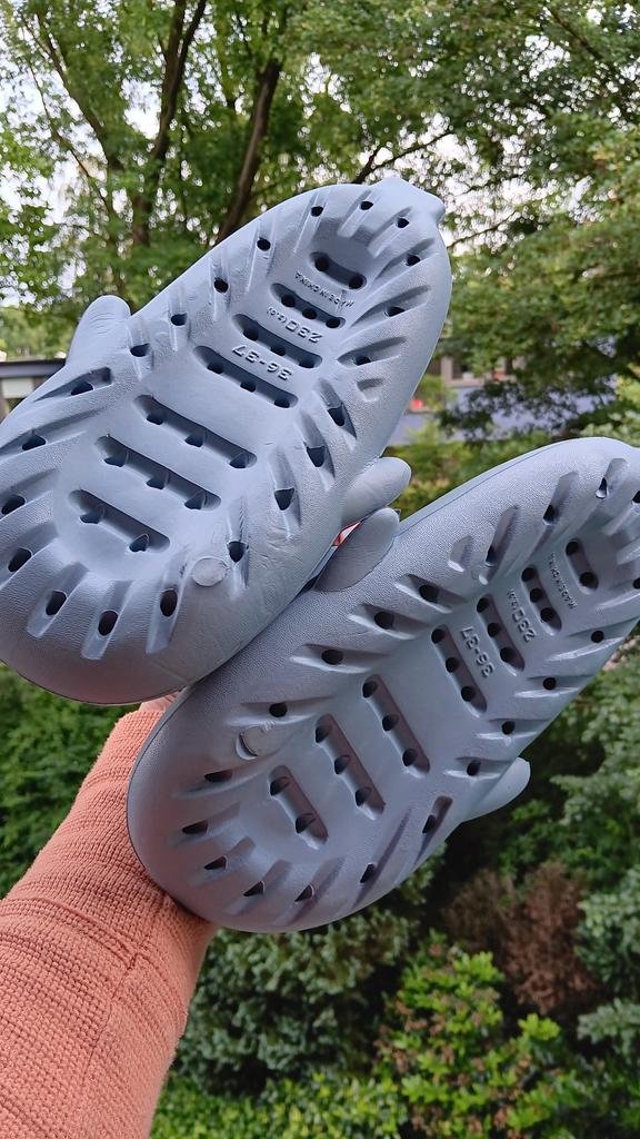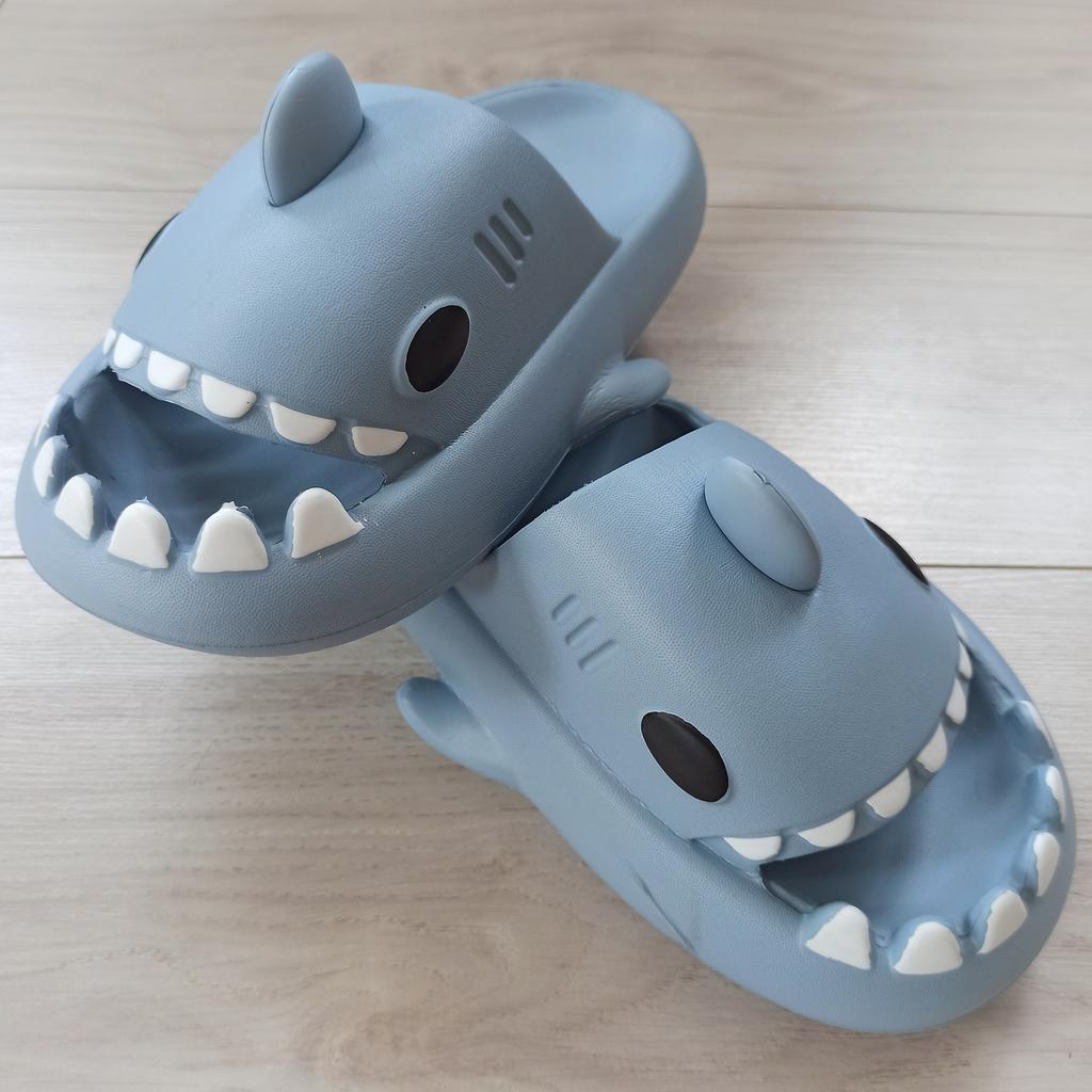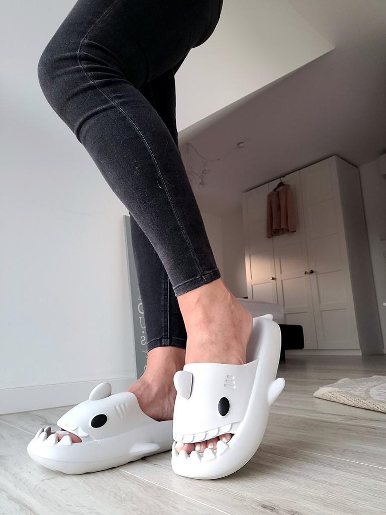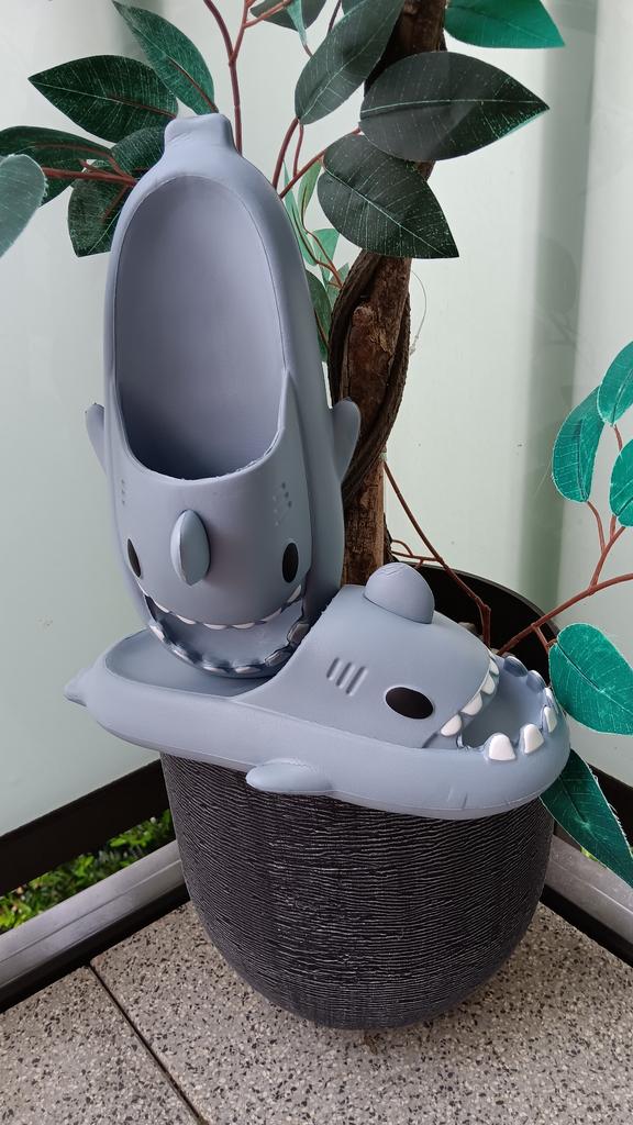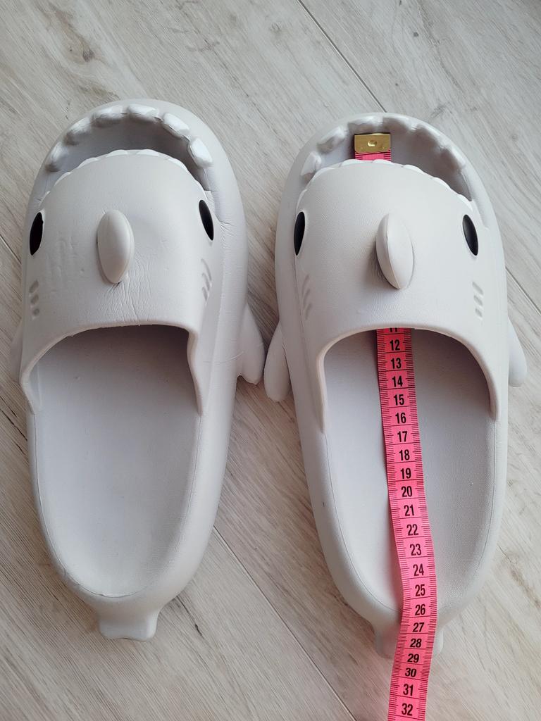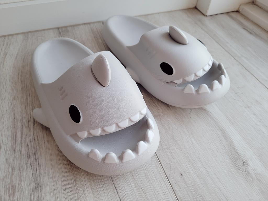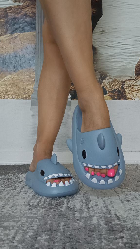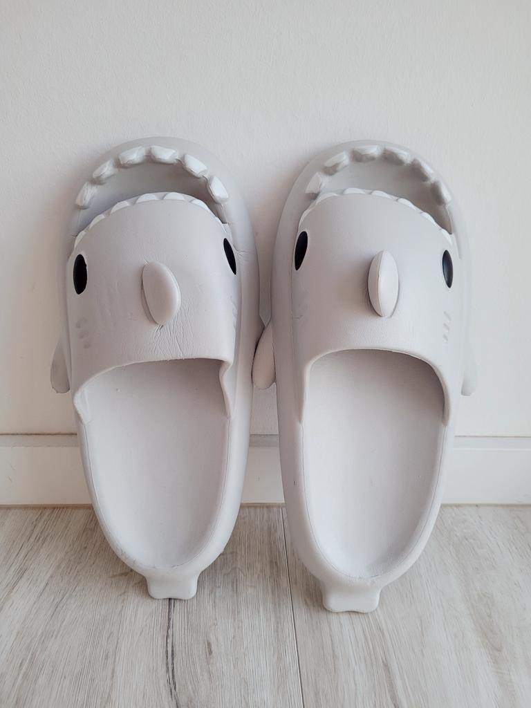 * Slippers in a shark look 🦈 * 💥𝗟𝗶𝗲𝗳𝗲𝗿𝘇𝗲𝗶𝘁 11 Take 💥𝗟𝗶𝗲𝗳𝗲𝗿𝘂𝗺𝗳𝗮𝗻𝗴 Comes with a pair of matching color and size slippers. They are available in 7 different colors in sizes 36-45 . I ordered slippers in sizes 42 to 43 in grey. I'm usually shoe size 40, I still have a little air in my shoes. I used the manufacturer's centimeters as a guide. I think 1 size smaller would have been a good fit. I would say the fit is more suited to a wide footbed. Not for narrow feet. 💥𝗤𝘂𝗮𝗹𝗶𝘁ä𝘁 The shoes are very comfortable. We have a pleasant soft footbed, which gives well. It's some kind of rubber/foam mix I think. The shoes don't pinch... They are ideal as flip-flops or slippers They don't smell like chemicals. I especially like the shark look. 🦈 For material composition : Unknown 💥𝗙𝗮𝘇𝗶𝘁 Very cute shark-look slippers that are perfect as flip-flops... you can order your original shoe size. 👌 The shoes are more suitable for a wide footbed. ‼️ A small disadvantage is that you could possibly stumble through the side fins, because the flip-flops become very wide on the foot.