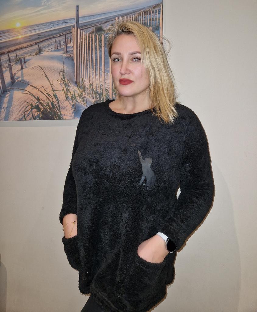 O-Neck Long Sleeves Pockets Mid-Length Winter Sweatshirt Women Loose Fit Embroidery Cat Pattern Fleece Pullover Top — buy online with free worldwide shipping!