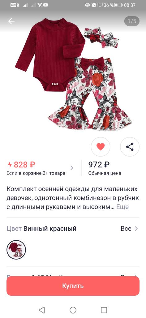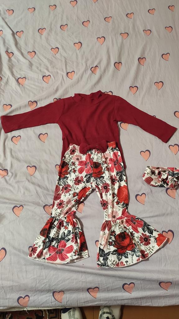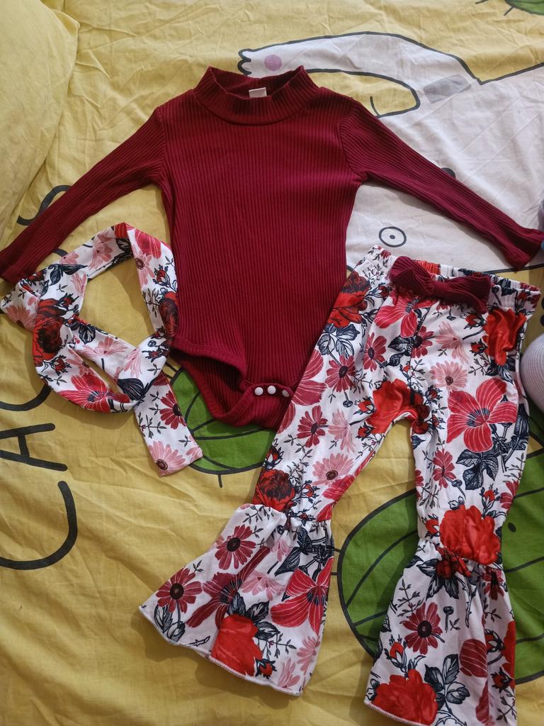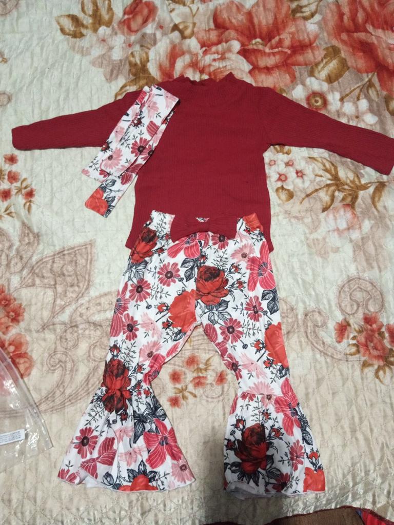 Infant Girl Autumn Clothes Set, Solid Color Ribbed Long Sleeve High Neck Romper + Flower Leaf Print Flare Pants + Headband — buy online with free worldwide shipping!