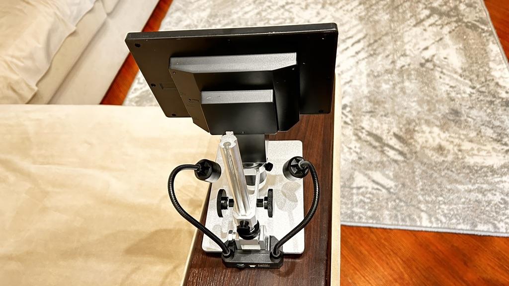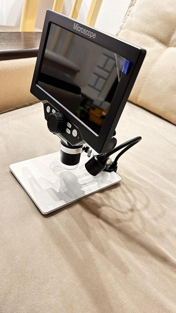 1: Vertical microscopes have an important drawback because they are used in wide applications such as solder on PCBs, model designation of some tiny chips, and metals, and it is easy to lose sight of the details of the objects due to reflection. Our product specifically addresses this issue. It is an angle-adjustable digital microscope that solves the problem of high reflection. It's a suitable experience in the electronics maintenance industry, and it's important to note that. This machine has a longer ranges than the others because it has certain amount of room to operate. It is very convenient to use tweezers, electric soldering iron and others under your microscope.