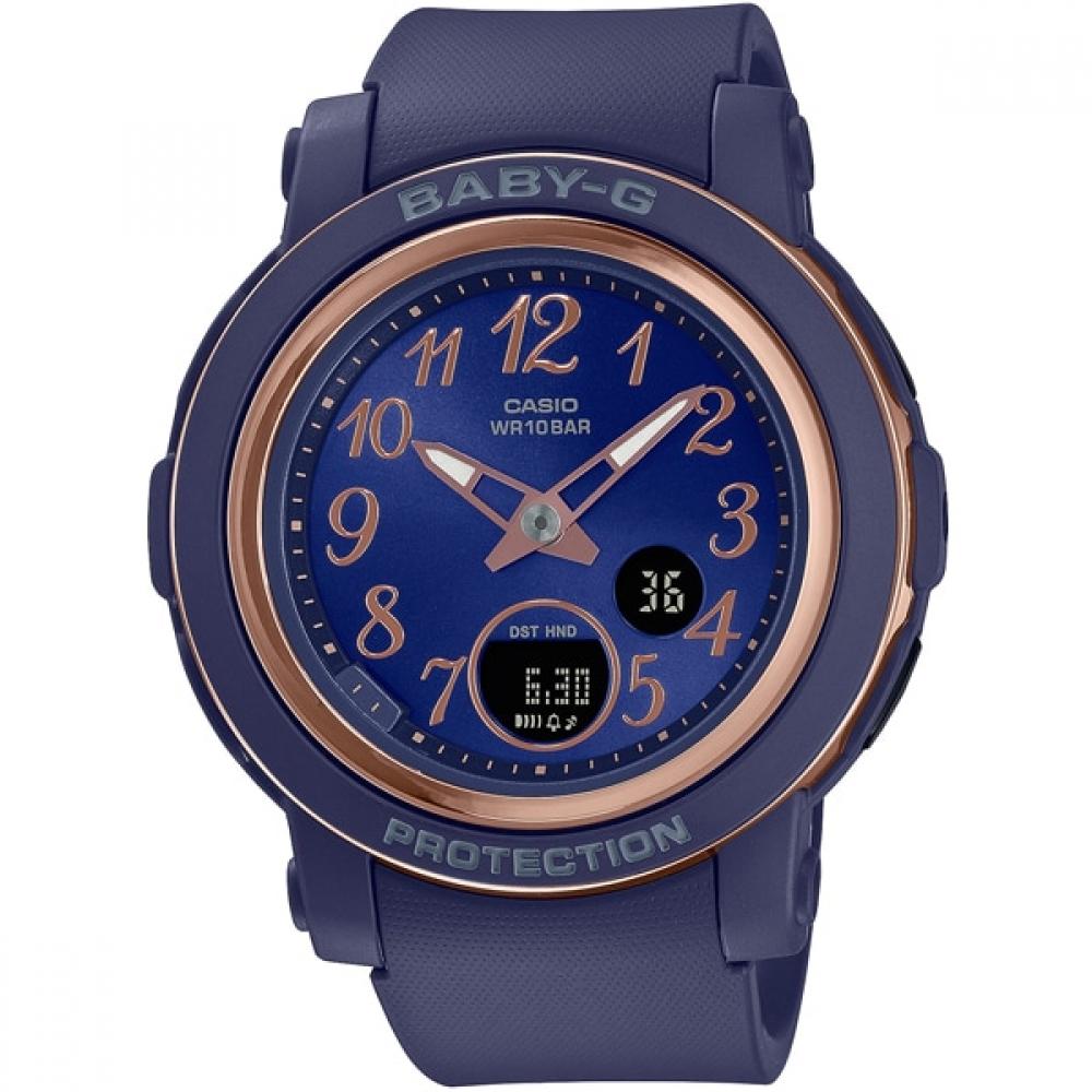 The CASIO BGA-290SA-2AJF is a wristwatch from the BABY-G wide face series, presented in a Navy blue color. This watch features a simple round case with a wide face that offers excellent readability. The use of rose gold for the hands and indexes provides a vibrant impression. Built to withstand shocks and featuring a waterproof rating of 10 ATM, this watch is perfect for outdoor activities. Additionally, it offers a lightweight and comfortable wearing experience.