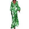 Ladies Dress Long Lantern Sleeve Deep V Neck High Waist Contrast Color Flower Print Big Hem Prom Banquet Cocktail Maxi Dress
