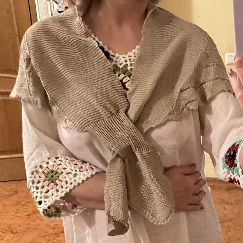 Machine-knitted cape (not crocheted), the color ordered was pink, but in reality, it turned out to be more beige, but it's okay, it will be suitable to throw over a dress in the summer