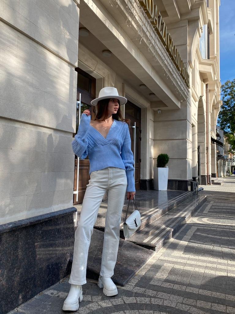 Sweater with deep low-cut neck Material is so pleasant to the body. On the parameters 84-60-85, height 167, size S sat a bit oversize. Details: -the sleeves are long enough -the neck is quite open, you can wear it with open shoulder; Can be combined with shorts, jeans,skirts . Good quality ! I really recommend it.