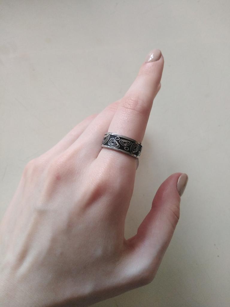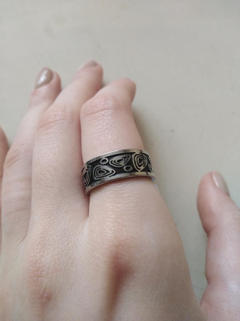 It looks very nice on the hand) In reality, the dark background is not like blackened silver, but literally black. The size corresponds to the description 🖤