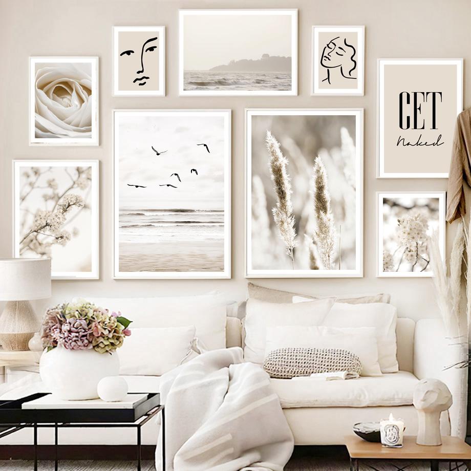Beach Birds Sea Flower Reed Grass Wall Art Prints Canvas Painting Line Face Nordic Poster Wall Pictures For Living Room Decor