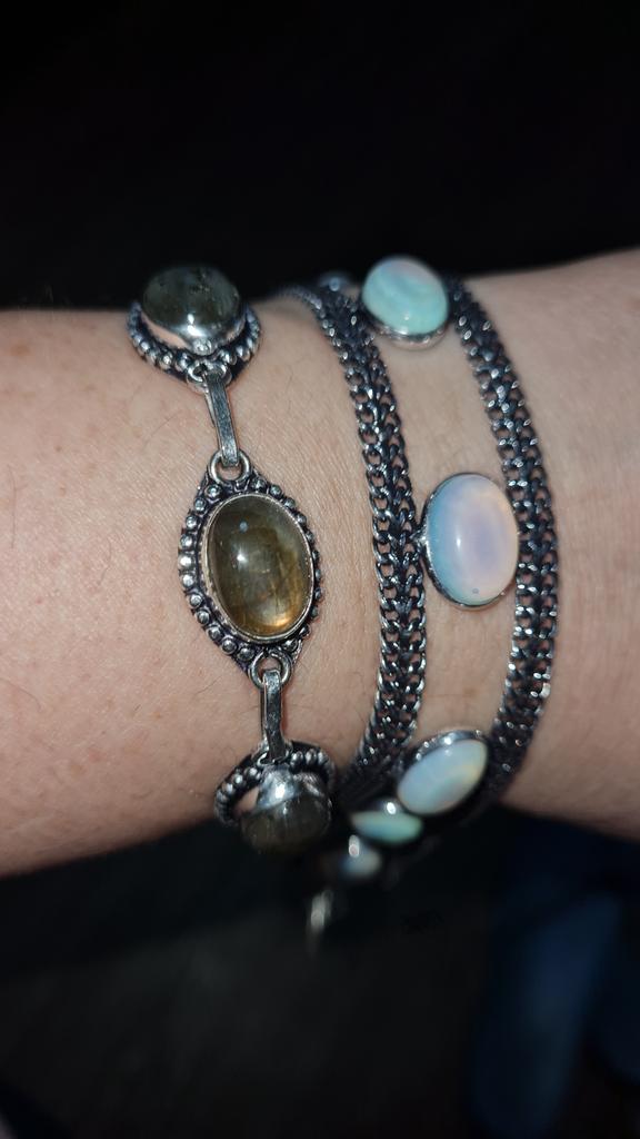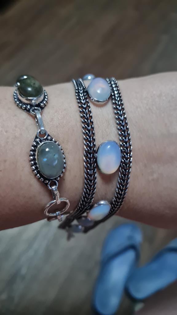A very beautiful bracelet with natural stones - it can be seen that it was processed by hand, because there are minor defects that do not affect the beauty of the stones. The metal is similar to silver, there is no sample.