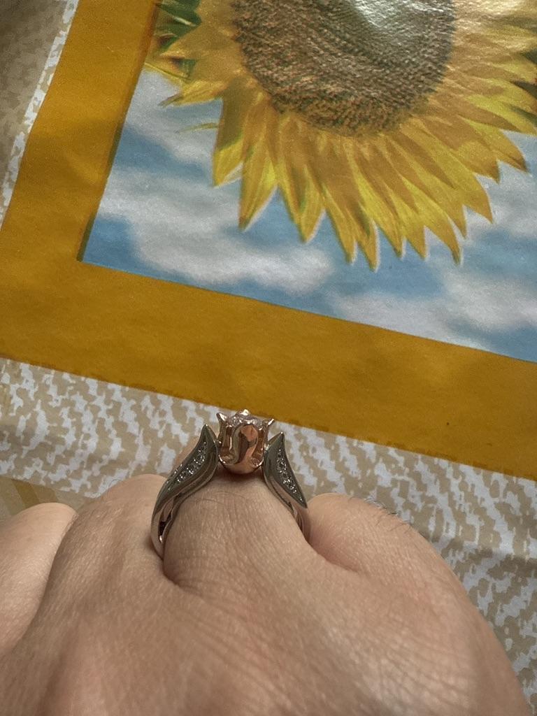 If you look at the ring from above - it looks pretty good, the stones are set neatly. But the circumference of the ring itself is awful - like a thick nut on a bolt. The side and bottom walls of the ring are very thick. There is also a protruding cone at the bottom, which is uncomfortable for the hand. And the ring itself seems simply huge, it does not look good on the hand. And the pink metal cylinder - flower from the side looks ugly, it is too huge. And this is not silver!!!