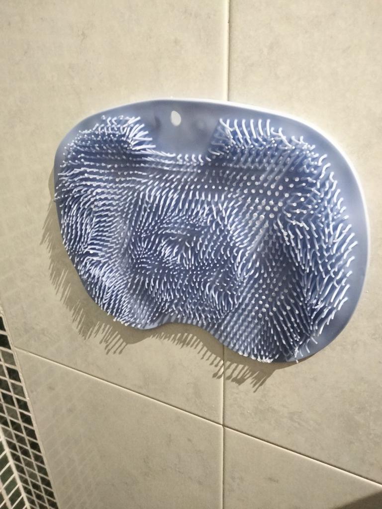 I ordered it in pink and it came in blue but otherwise great, I put a hook on it to make it easier to dry when I'm done using it. It is a joy to get on the soles of your feet without having to bend over with the sponge. It is soft to the touch since the material is silicone. It doesn't scratch or hurt.