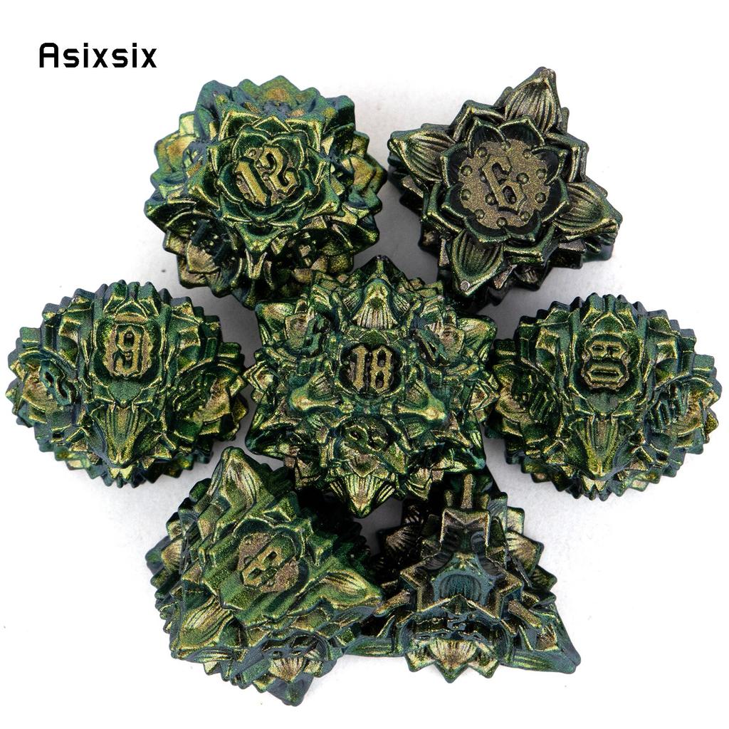 7 Pcs Green Yellow Lotus Flower Metal Dice Solid Metal Polyhedral Dice Set Suitable for Role-Playing RPG Board Game Card Game — buy online with free worldwide shipping!