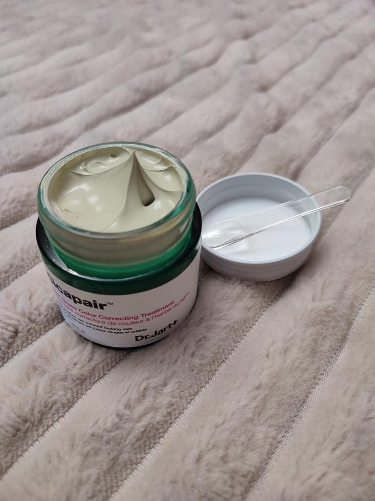 The moist green cream adheres thinly and gently to the skin to cover blemishes and correct irregularities.
