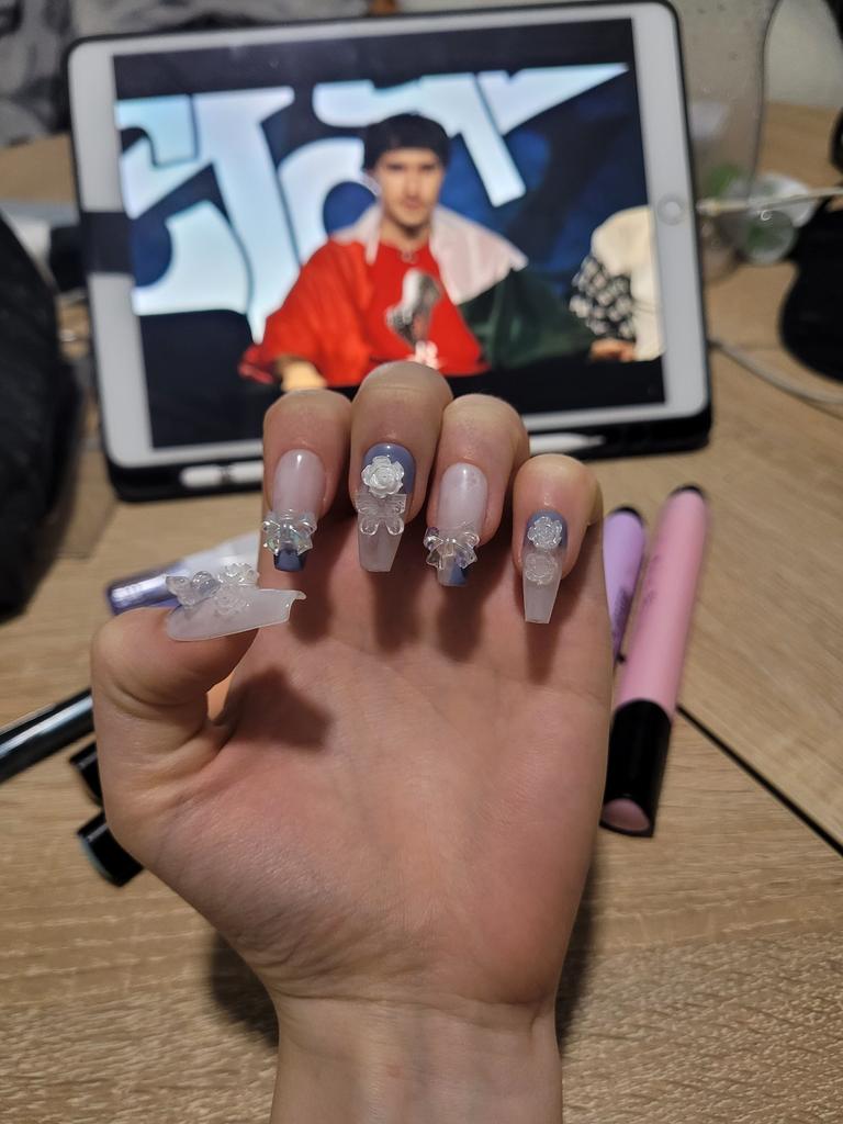 HANDMADE Artificial Nail Aurora Bow Knot Camellia Butterfly Transparent Haze Blue Contrast Color Phototherapy Nails Reusable and Removable Nails — buy online with free worldwide shipping!