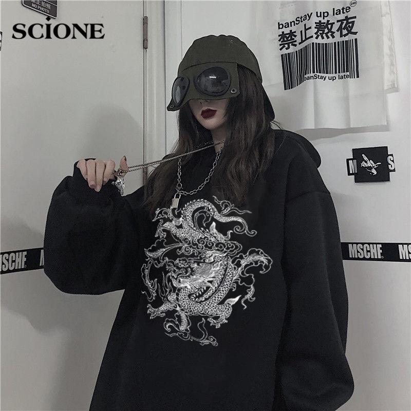 Gothic Dragon Print Hoodies Women Harajuku Vintage Hoodie Sweatshirt Oversized Streetwear Y2k Casual Winter Autumn Grunge Coat