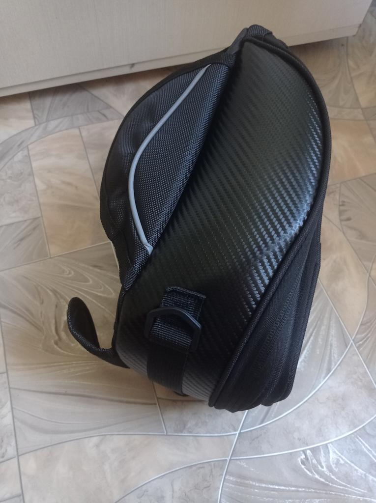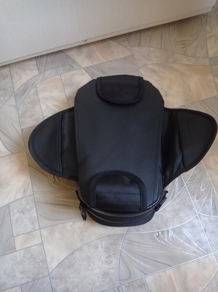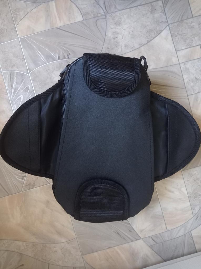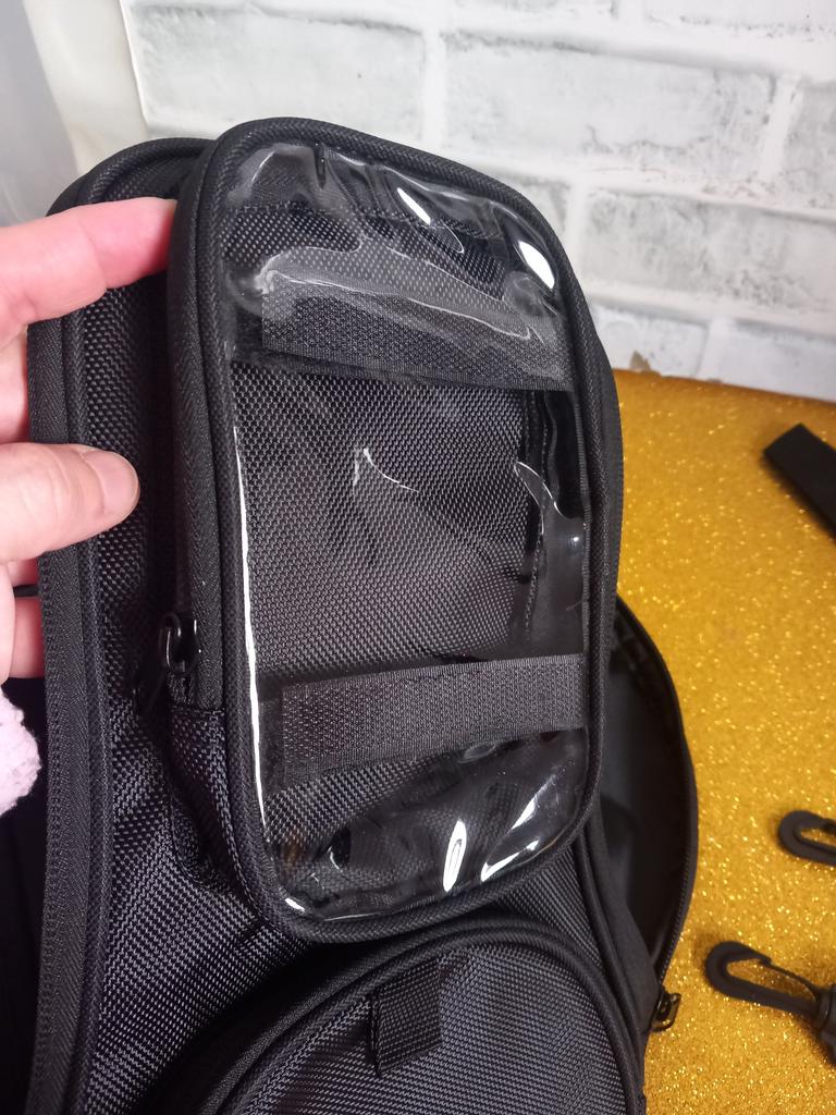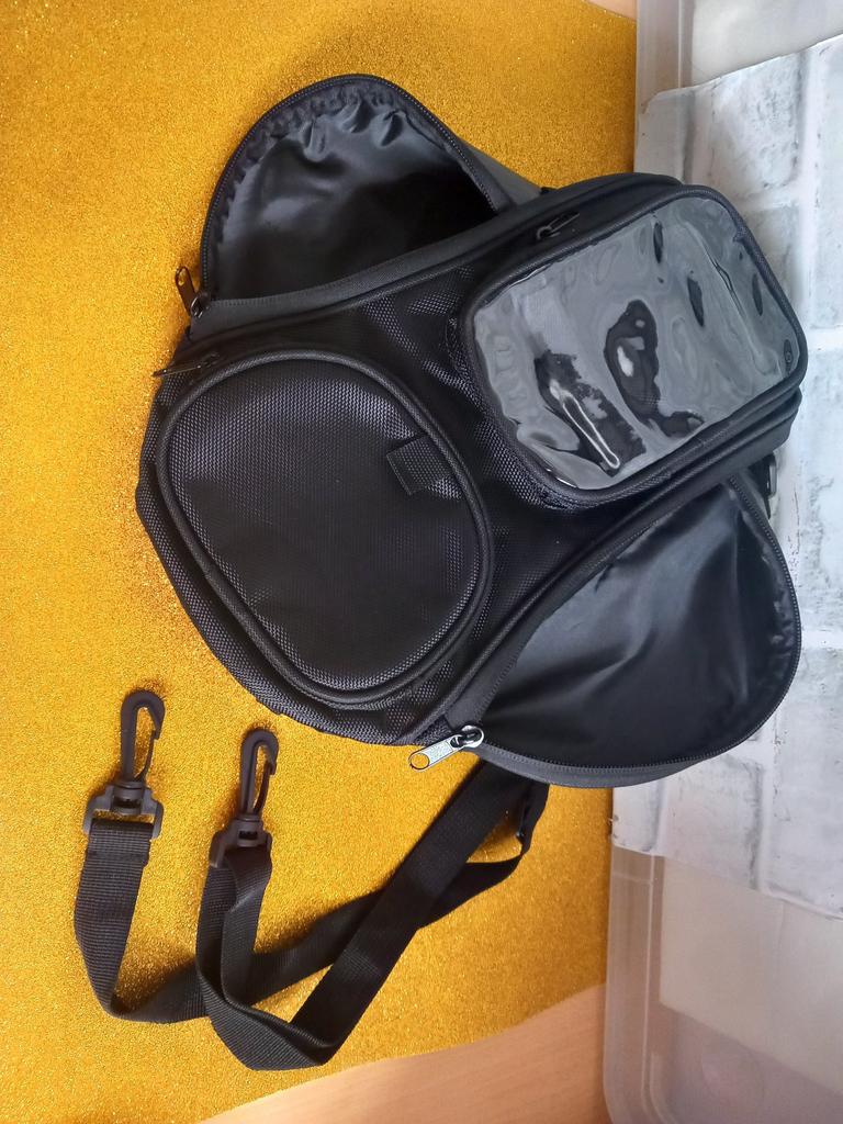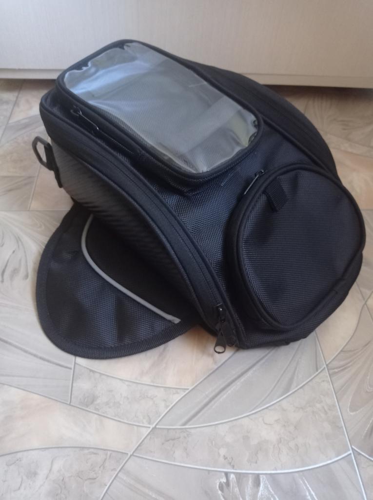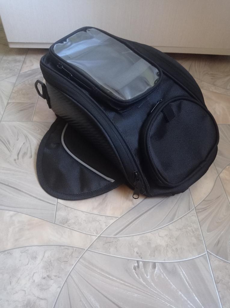 Motorcycle tank bag. The motorcycle tank bag has a main, front and two side compartments, an upper pocket, front and inner transparent pockets. Small things and items can be placed in the front compartment. On the front part of the frontal compartment there is a transparent pocket in which you can put a card, navigator, phone or tablet. The side compartments in the form of large patch pockets allow you to distribute the contents in the order you need. The top pocket is also suitable for storing a mobile phone. All pockets and compartments are tightly closed with a zipper. The motorcycle bag is made of super-strong material that is resistant to tearing and deformation. And thanks to the waterproof cover, you can transport the contents of the motorcycle bag to the tank in any weather. Definitely recommend.
