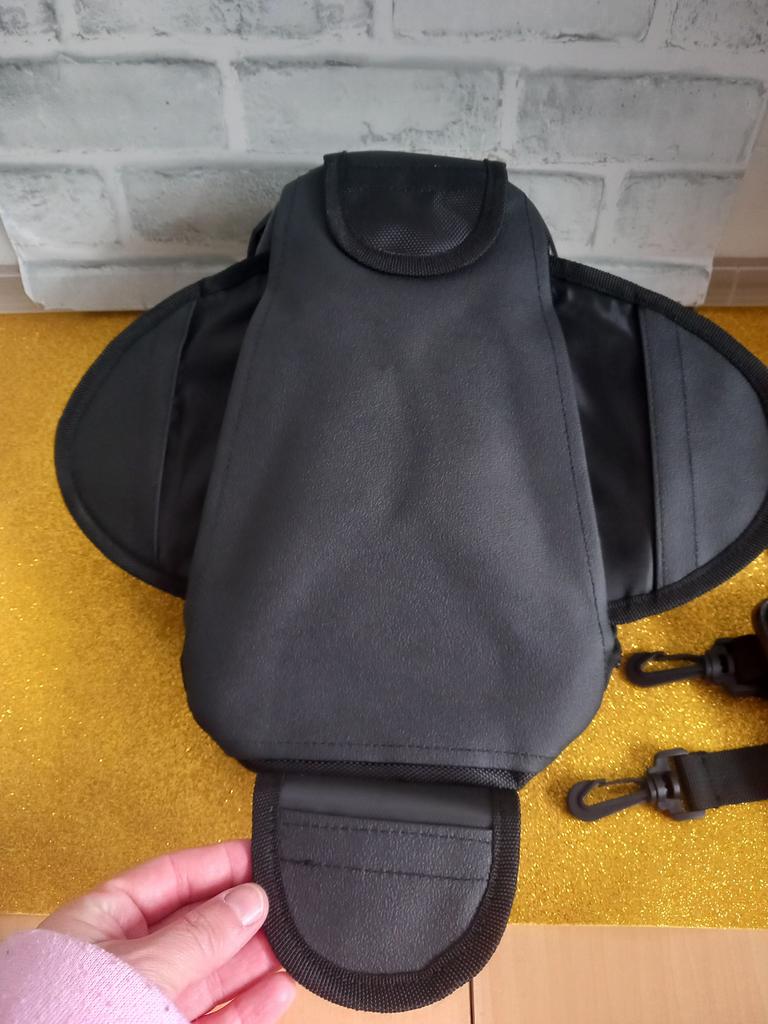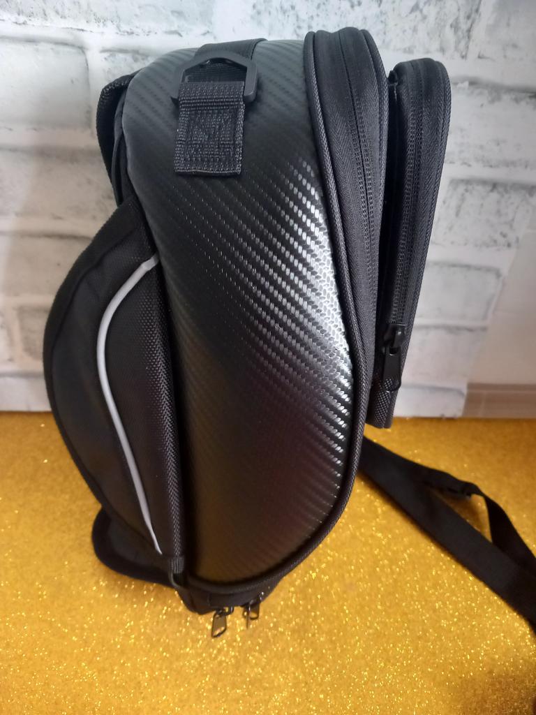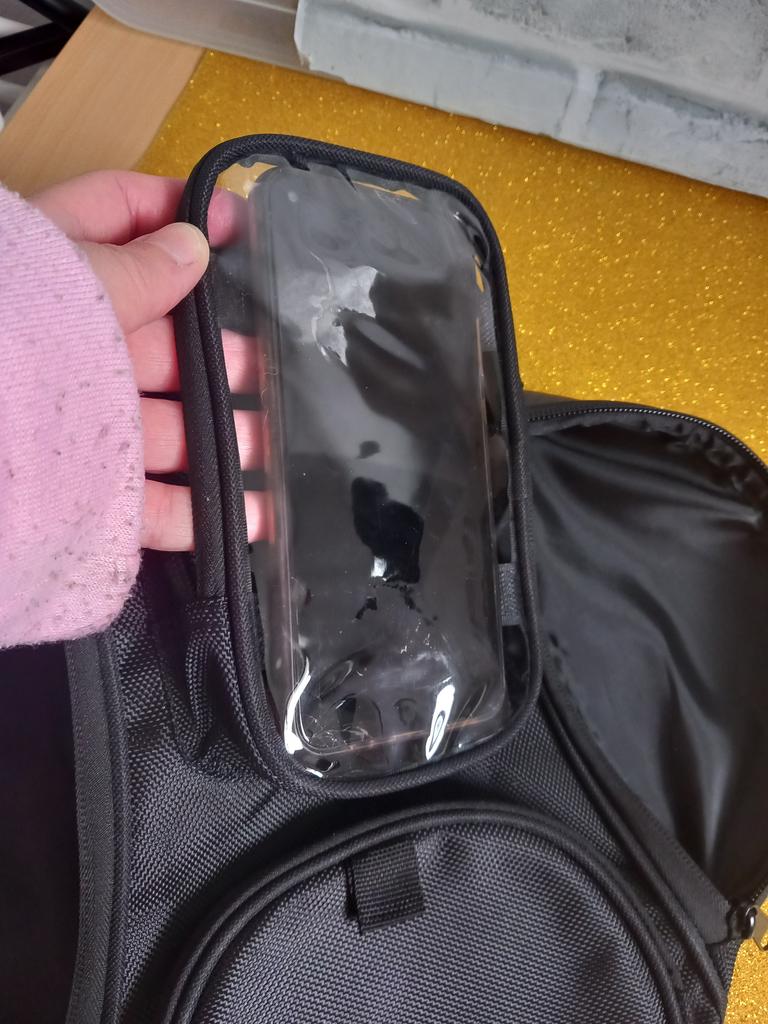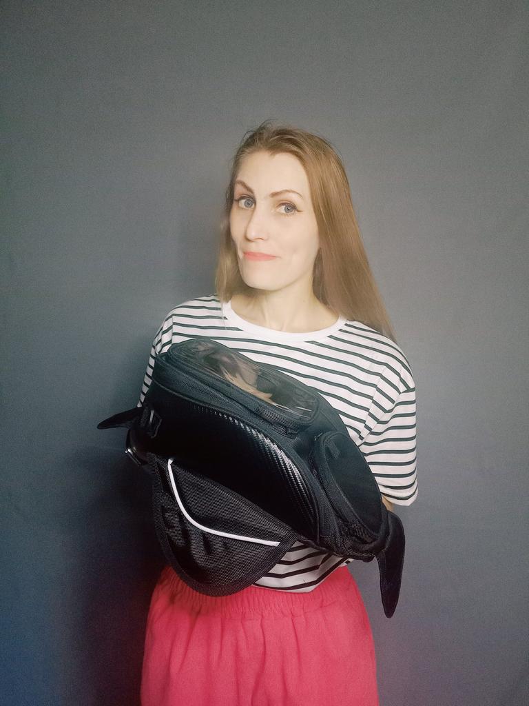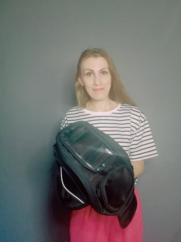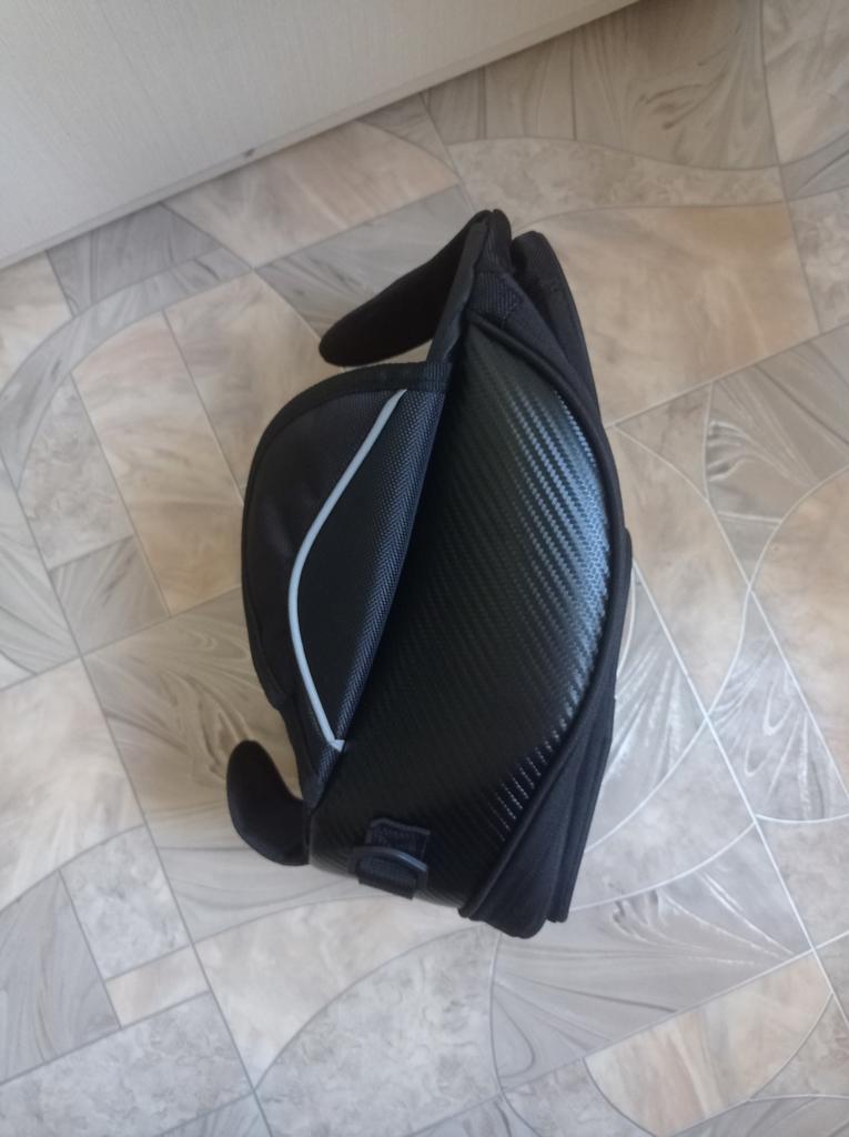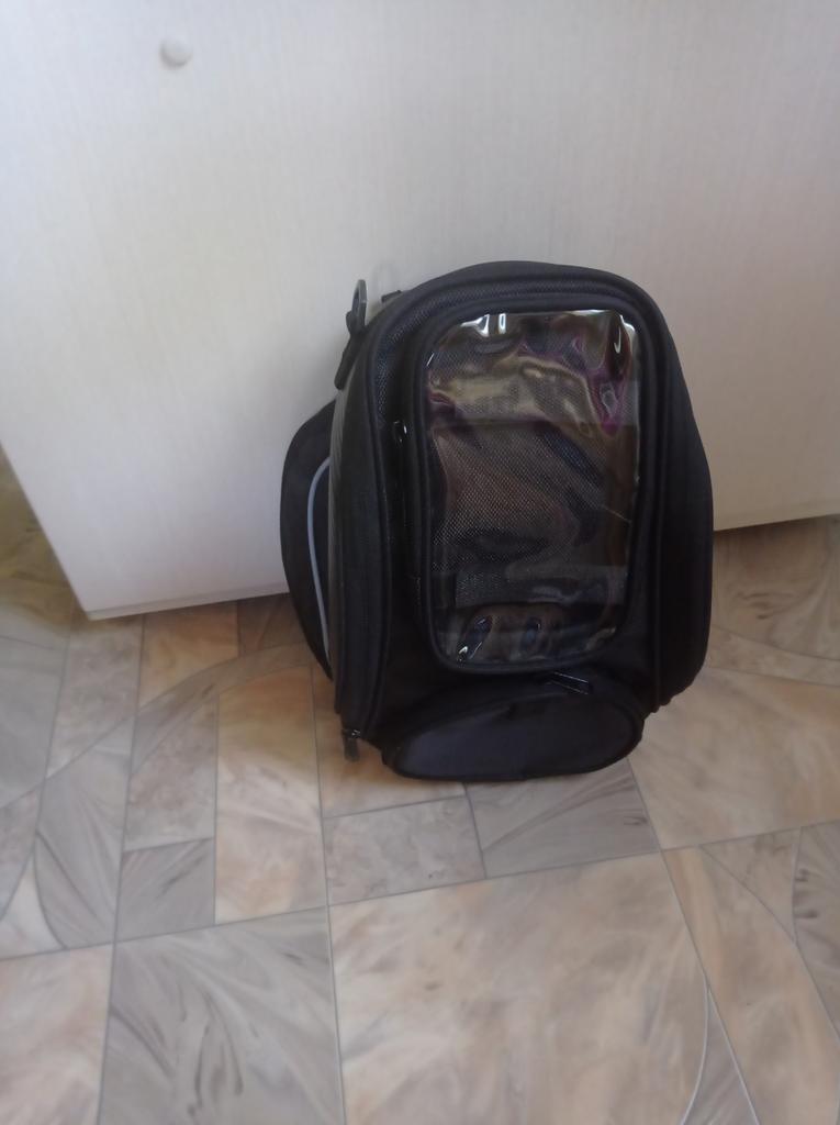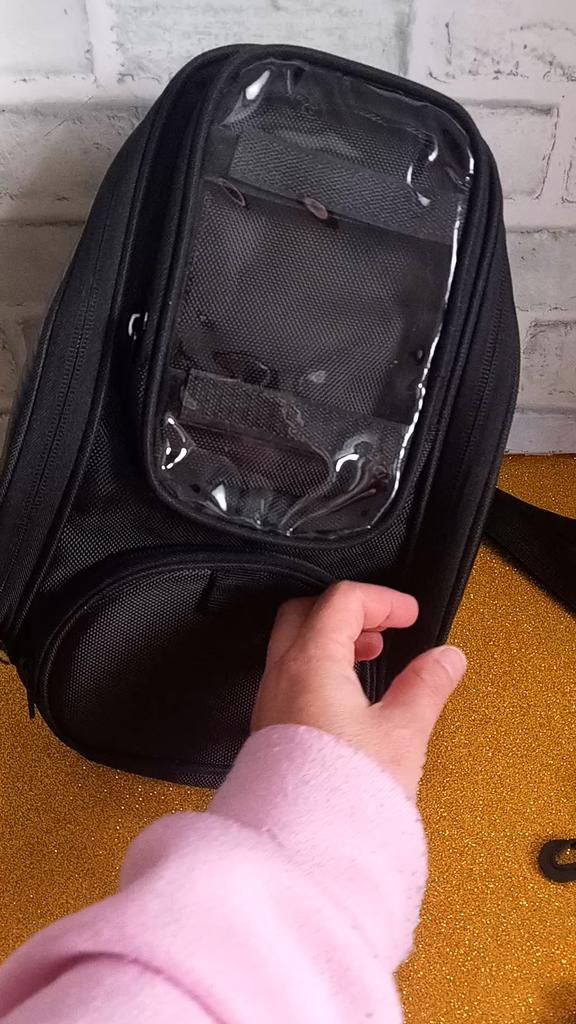 Motorcycle tank bag. The motorcycle tank bag has a main, front and two side compartments, an upper pocket, front and inner transparent pockets. Small things and items can be placed in the front compartment. On the front part of the frontal compartment there is a transparent pocket in which you can put a card, navigator, phone or tablet. The side compartments in the form of large patch pockets allow you to distribute the contents in the order you need. The top pocket is also suitable for storing a mobile phone. All pockets and compartments are tightly closed with a zipper. The motorcycle bag is made of super-strong material that is resistant to tearing and deformation. And thanks to the waterproof cover, you can transport the contents of the motorcycle bag to the tank in any weather. Definitely recommend.