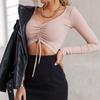 Women Spring Summer Long Sleeve V Neck Solid Color Drawstring Bare Midriff T Shirt