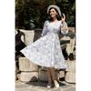 Women's Blue Floral Square Neck Watermelon Sleeve Flared Dress