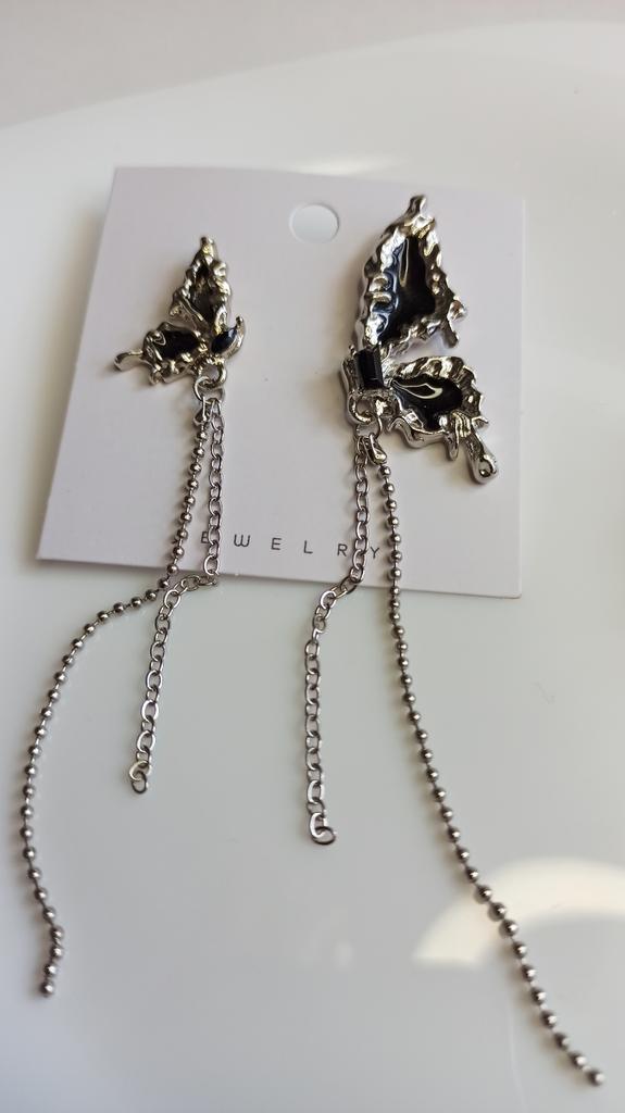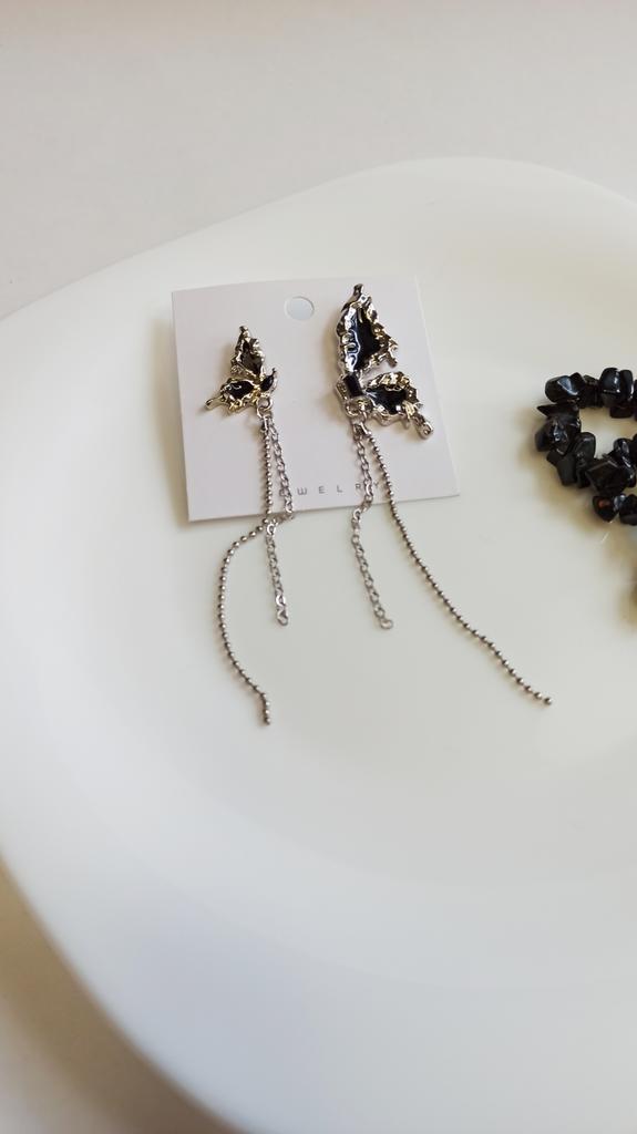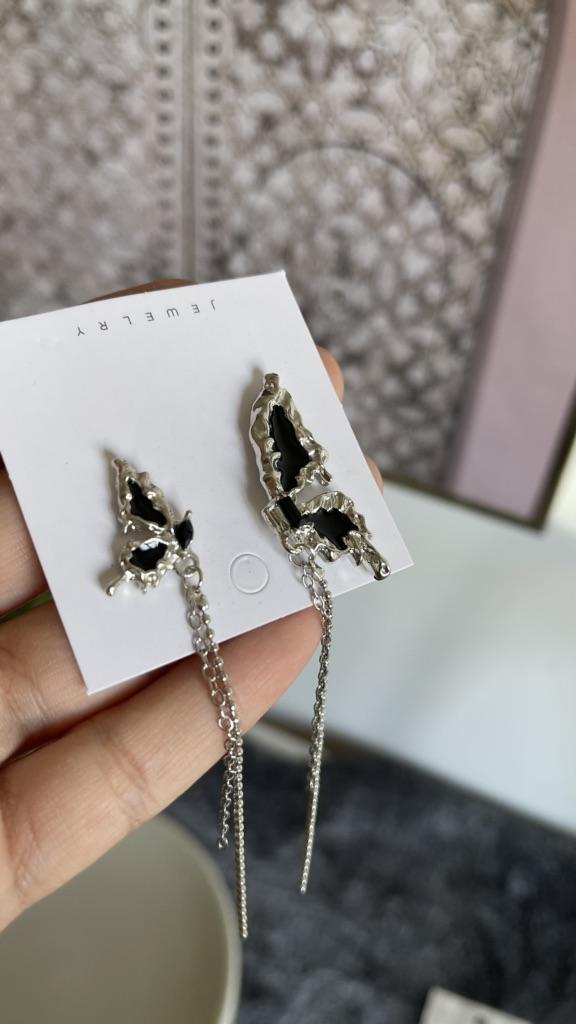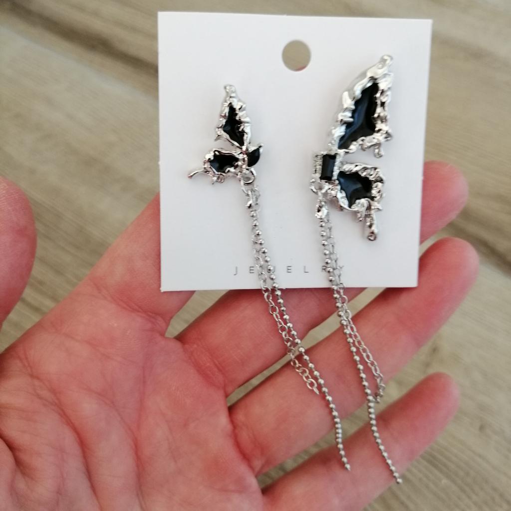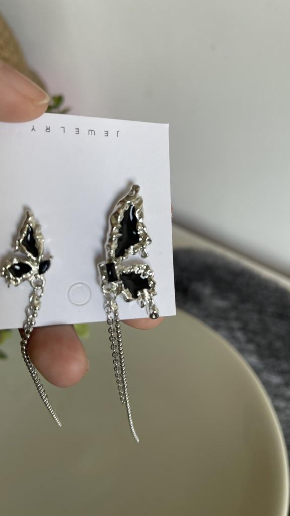 This is Chic and Unique Butterfly Earrings , A Must-Have😍 I'm thrilled with my purchase of these asymmetrical butterfly earrings. Their half-wing design per ear is both unique and eye-catching. The black stones add an elegant flair, and the tassel detail brings a playful yet stylish touch. Made of Cubic Zirconia and Copper, these earrings (17*20mm, 10g) are lightweight and comfortable, perfect for daily wear. The added chain on each wing is a lovely feature, enhancing their beauty. Delivery was fast, arriving in just 9 days. In summary, these earrings are a fantastic fashion statement. Highly recommended for their distinctive style and quality! أنا متحمسة جداً لشرائي هذه الأقراط الفراشة غير المتماثلة. تصميمها النصفي لكل أذن فريد وجذاب. الأحجار السوداء تضيف لمسة من الأناقة، والتفصيل الشراشيب يجلب لمسة مرحة وأنيقة في نفس الوقت. مصنوعة من الزركونيا المكعبة والنحاس، هذه الأقراط (17*20 مم، 10 جم) خفيفة الوزن ومريحة، مثالية للارتداء اليومي. السلسلة المضافة على كل جناح هي ميزة جميلة تعزز جمالها. كان التوصيل سريعًا، ووصلت في غضون 9 أيام فقط. باختصار، هذه الأقراط هي بيان أزياء رائع. أوصي بها بشدة لأسلوبها المميز وجودتها!