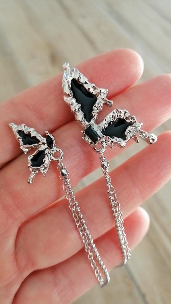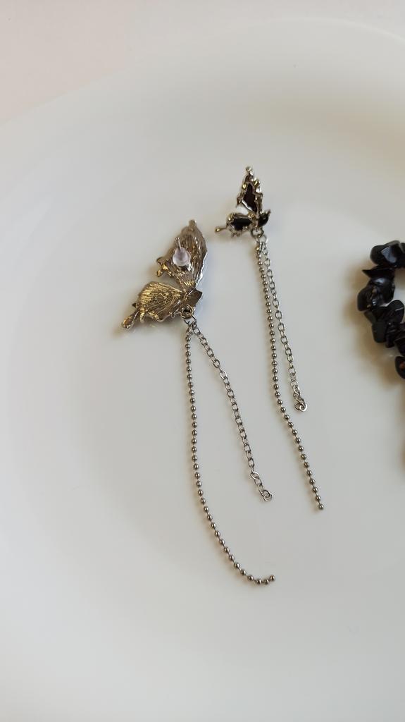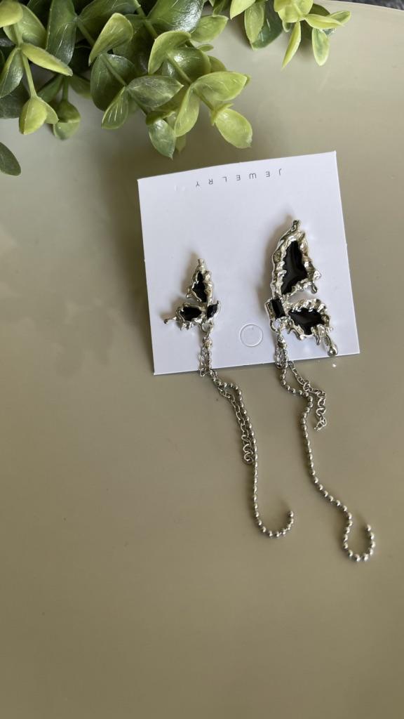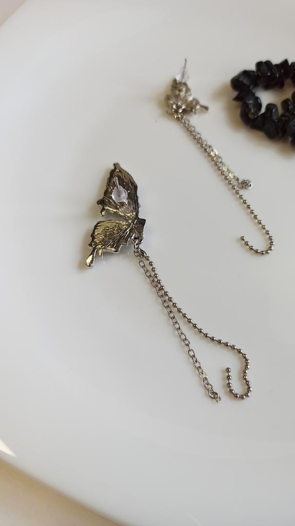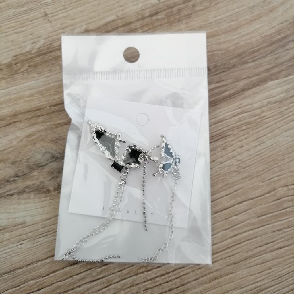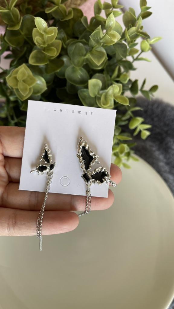 This is Chic and Unique Butterfly Earrings , A Must-Have😍 I'm thrilled with my purchase of these asymmetrical butterfly earrings. Their half-wing design per ear is both unique and eye-catching. The black stones add an elegant flair, and the tassel detail brings a playful yet stylish touch. Made of Cubic Zirconia and Copper, these earrings (17*20mm, 10g) are lightweight and comfortable, perfect for daily wear. The added chain on each wing is a lovely feature, enhancing their beauty. Delivery was fast, arriving in just 9 days. In summary, these earrings are a fantastic fashion statement. Highly recommended for their distinctive style and quality! أنا متحمسة جداً لشرائي هذه الأقراط الفراشة غير المتماثلة. تصميمها النصفي لكل أذن فريد وجذاب. الأحجار السوداء تضيف لمسة من الأناقة، والتفصيل الشراشيب يجلب لمسة مرحة وأنيقة في نفس الوقت. مصنوعة من الزركونيا المكعبة والنحاس، هذه الأقراط (17*20 مم، 10 جم) خفيفة الوزن ومريحة، مثالية للارتداء اليومي. السلسلة المضافة على كل جناح هي ميزة جميلة تعزز جمالها. كان التوصيل سريعًا، ووصلت في غضون 9 أيام فقط. باختصار، هذه الأقراط هي بيان أزياء رائع. أوصي بها بشدة لأسلوبها المميز وجودتها!