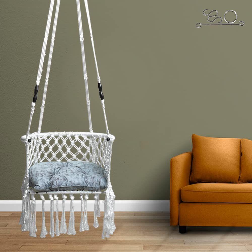 Colour: WhiteMaterial: PolyesterFrame Material: PolyesterFinish Type: SilverItem Weight350 GramsMaximum Weight Recommendation150 KilogramsMaximum number of compatible seats1Assembly RequiredYesAbout this itemPRODUCT SPECIFICATIONS: Built with strong and durable polyester rope with extra thickness for maximum stability and comfort, the entire swing measures at Back Support: 28 Inches, Breadth: 18 Inches, Full Height: 60 Inches, Weight-bearing capacity 150 Kgs, Color: White Swing with Silver D Shape Cushion, Swing Shape: C Shape.COMFORTABLE HAMMOCK SWING CHAIR: This stylish hammock swing chair with a cushion is comfortable and durable. It does not lose the polyester thread, allowing the user to enjoy the soft sponge comfort, and it is large enough to have enough space to relax and stretch. Handmade bohemian style hammock swing/ Jhula/ jhula chair/ swing chair for home/ with macrame net chair pattern and tassels, adding a unique touch to your place.SWING FOR INDOOR/OUTDOOR USE: Anytime, anywhere can easily move - in addition to the balcony, terrace, backyard outside more, reading books, magazines, or tablet at the same time to hang out and snuggling in the comfortable premium swing cushion/ chair cushion - listen to the rain, crickets, birds, or enjoy a quiet night. Durable design that is comfortable for the whole family.QUALITY ASSURANCE: hammock swing chairs are designed with sturdy woven polyester ropes and strong & sturdy metal frames to ensure that they will not be torn or damaged, can hold up to 150 kgs, safe for both adults and children. The soft and sturdy premium swing chair/ indoor swing chair/ jhoola for home. It is impossible to penetrate using traditional hanging chairs, so it is a good place for children or pets, and there is no smell and the chair is very comfortable.COZY AND RELAXING CUSHION: The hammock chair provides the best reading space, and with the relaxing swing cushion, you can choose a comfortable posture, and then you can easily meditate or enjoy the scenery. The elegant and modern hanging swing chair cushion can also be used when reading, meditating, relaxing, watching TV, playing with your kids, and so on. Hanging accessories are included that can suspend the hanging swing chair (2S Hooks & 1 Rod, 1 Ring).