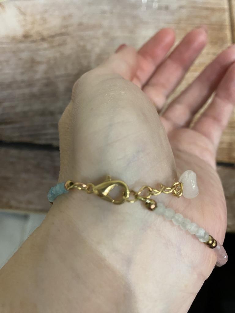 Very delicate bracelet. It's a bit too big, though. I cut off a little of the chain and attached the rose quartz from the previous bracelet.