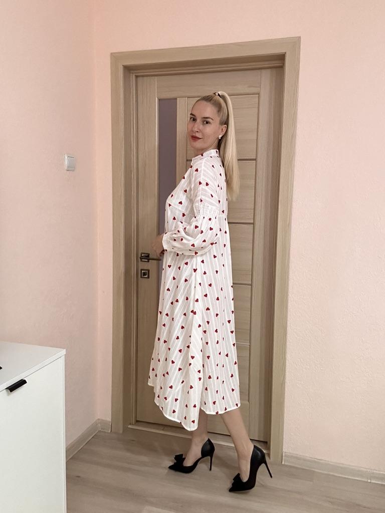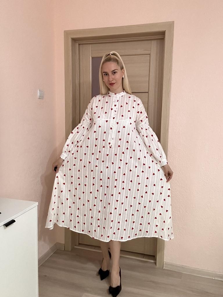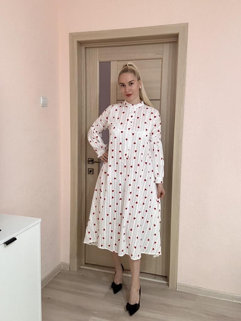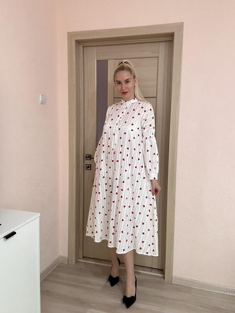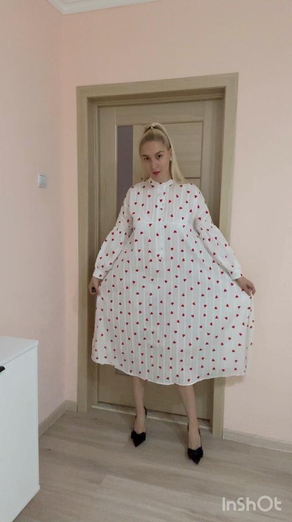 Heart - dress, see-through (needs a slip) fabric white, with very bright hearts. For summer, long sleeves (to hide from the sun) comfortable. Corresponds to the description