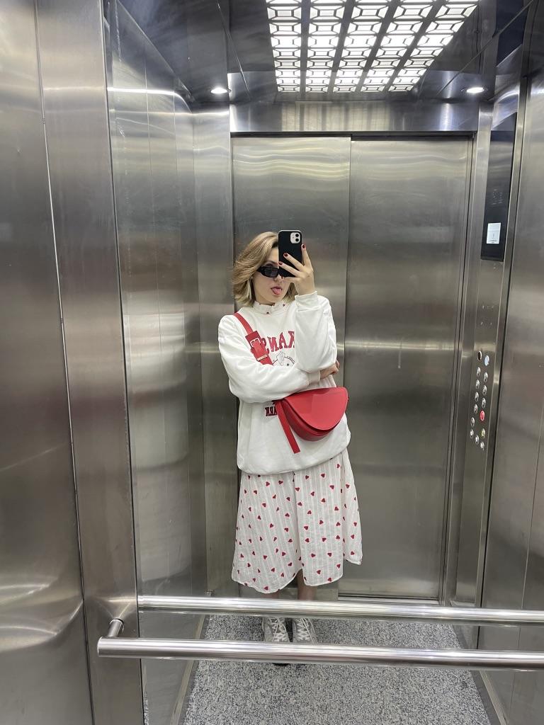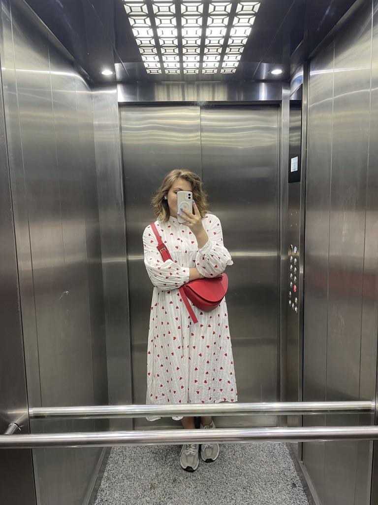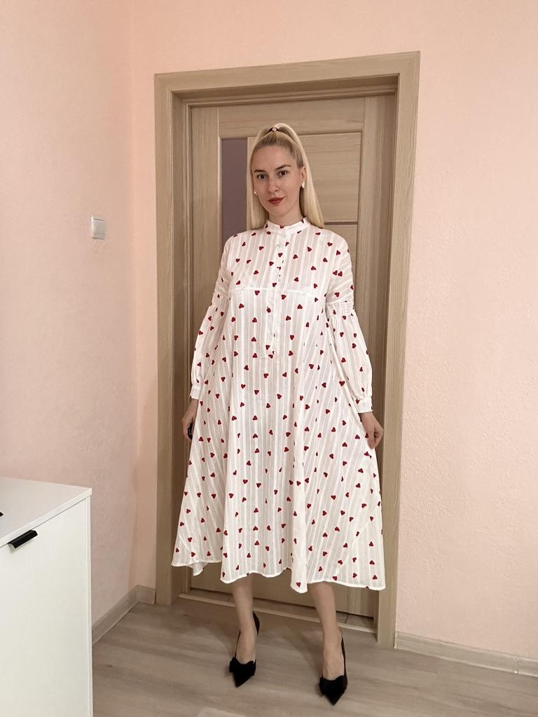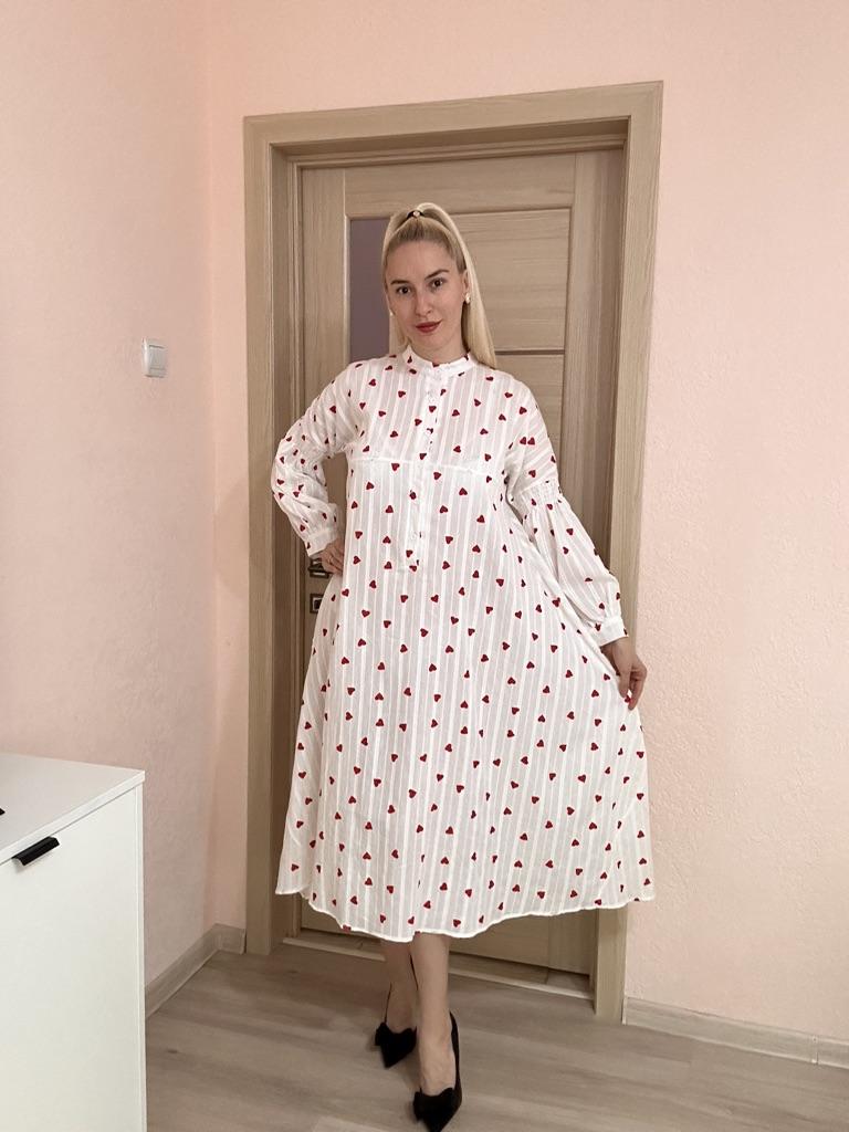 Heart - dress, see-through (needs a slip) fabric white, with very bright hearts. For summer, long sleeves (to hide from the sun) comfortable. Corresponds to the description