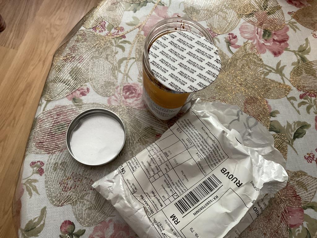 The jar is opened!!! The contents are spilling out. The packaging is just in a bag. The jar is dented.