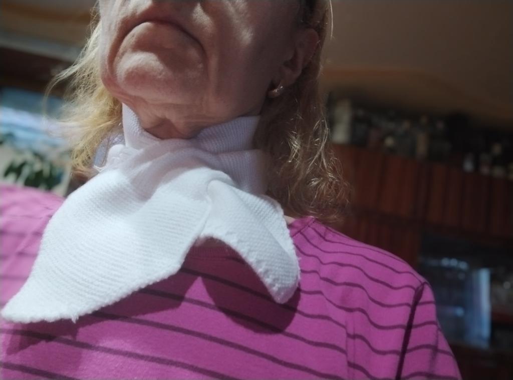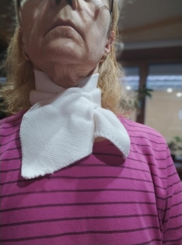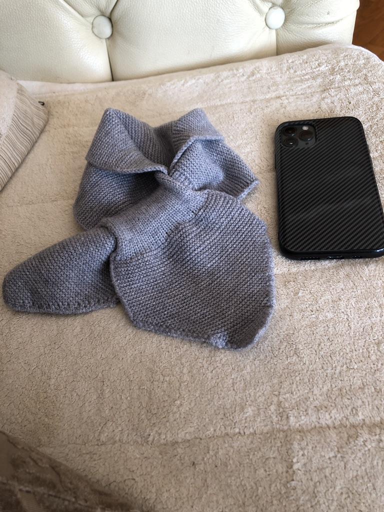 The scarf is beautiful, but very small, the neck is very narrow. I have a thin neck, but it is also small for me. You can see that the second end of the scarf cannot be straightened. It is twisted. One end lies well, but the other does not. In your photo, both ends of the scarf lie evenly, but in mine they do not.