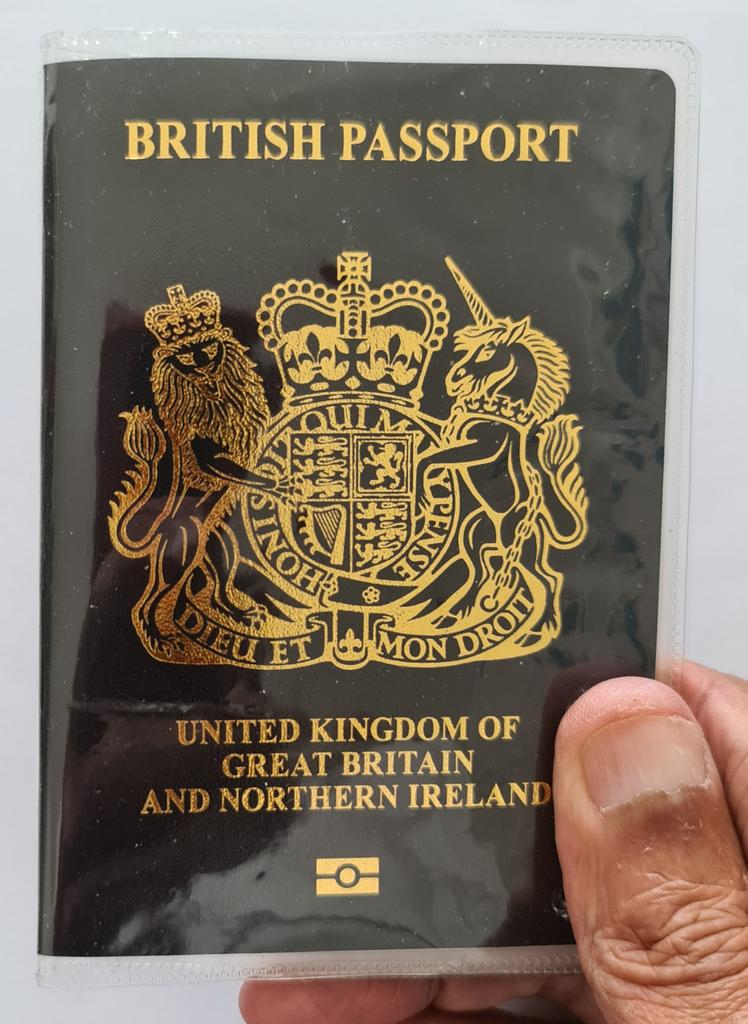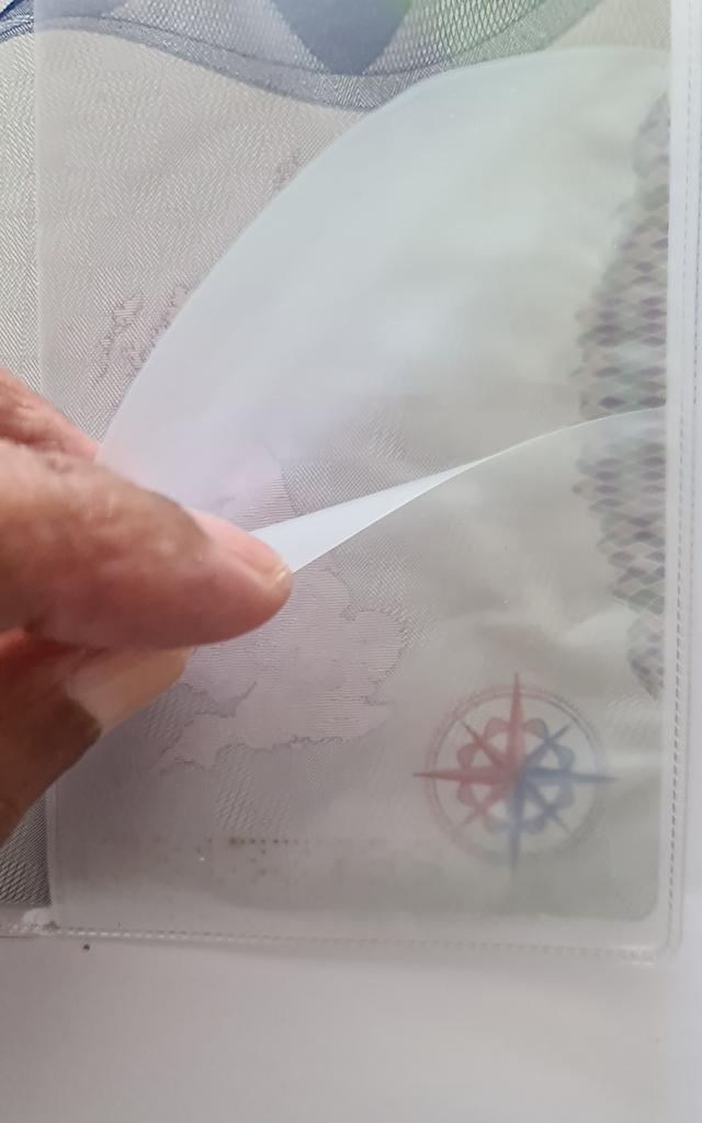 Clear plastic cover for passports. It has two pockets at one side for travel tickets/boarding passes.