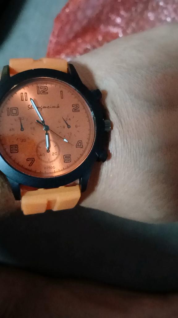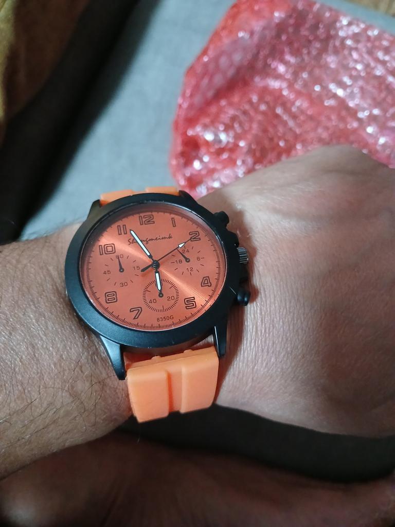 Very nice watch easy to use. The dial background is metallic orange and the strap is large.
