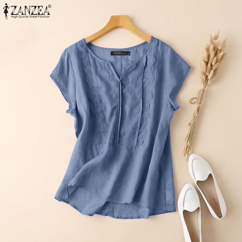 ZANZEA Women Summer V-neck Short Sleeve Lace Splice Blouse Tops — buy online with free worldwide shipping!