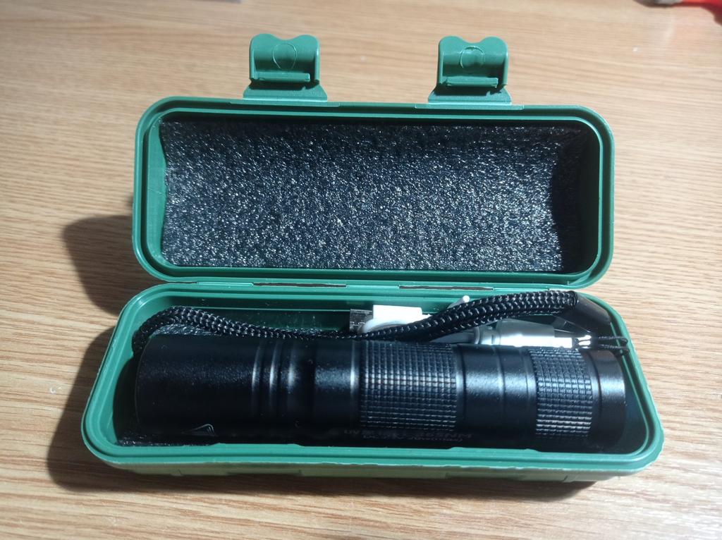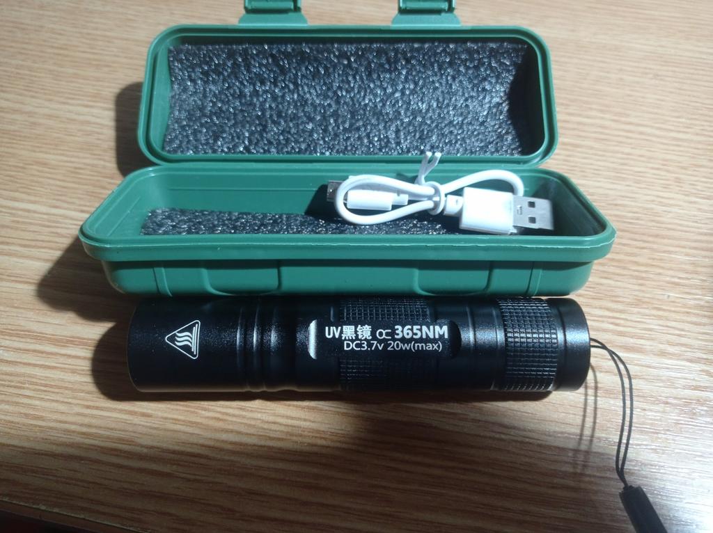 Excellent UV flashlight, arrived in a small container-like box. Charges through micro-USB (cable included). Overall 10/10. I recommend ✅