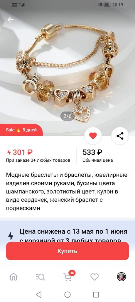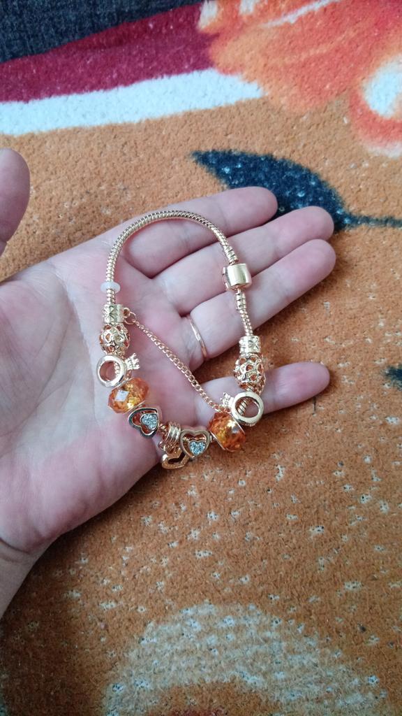 This bracelet is very cute for summer. Golden color. Heart-shaped pendants, some imitating amber. But there is, I think, one drawback - the bracelet does not stretch at all. So it's suitable for thin hands.