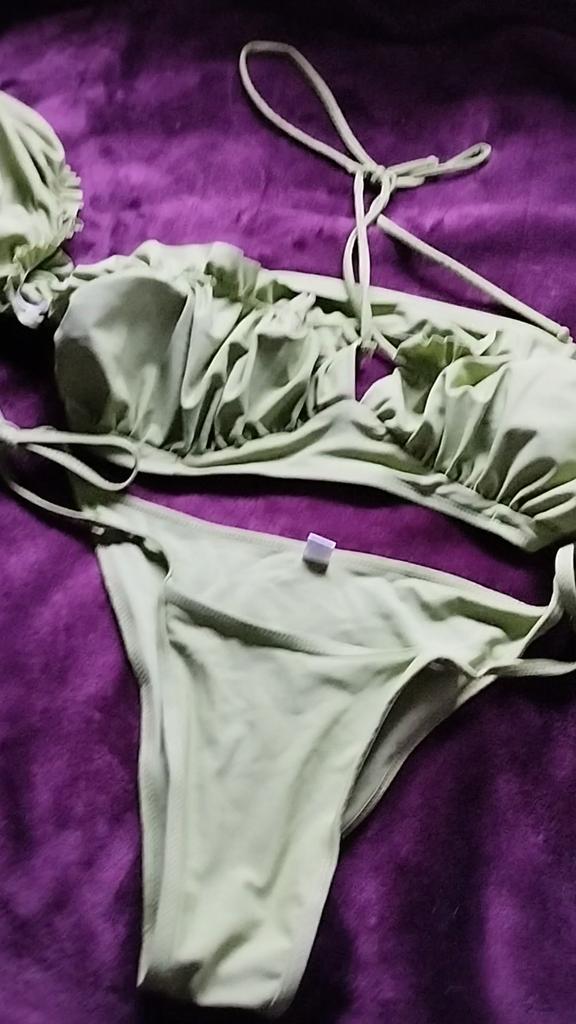 The fabric is beautiful. The green color looks good. I took L I weigh 60kg. 90B (Europe) chest level small problem, you really need to have a very firm chest and close breasts because there is no underwire support on the sides of the top, the fabric does not provide any support from its lining..The cup is very plunging, the chest escapes!!! The panties fit me because they are adjustable with the laces. The bikini top does not have a closure, it is bandeau.