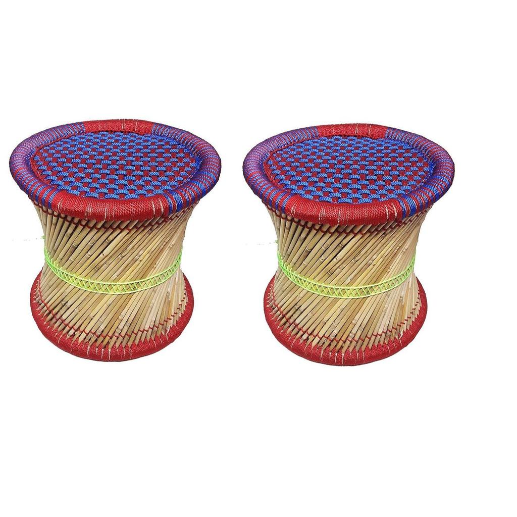 Eco-Friendly Cane Wood Bamboo Sitting Stool, Mudda for Indoor/Outdoor (Blue, Red: Set of 2) — buy online with free worldwide shipping!