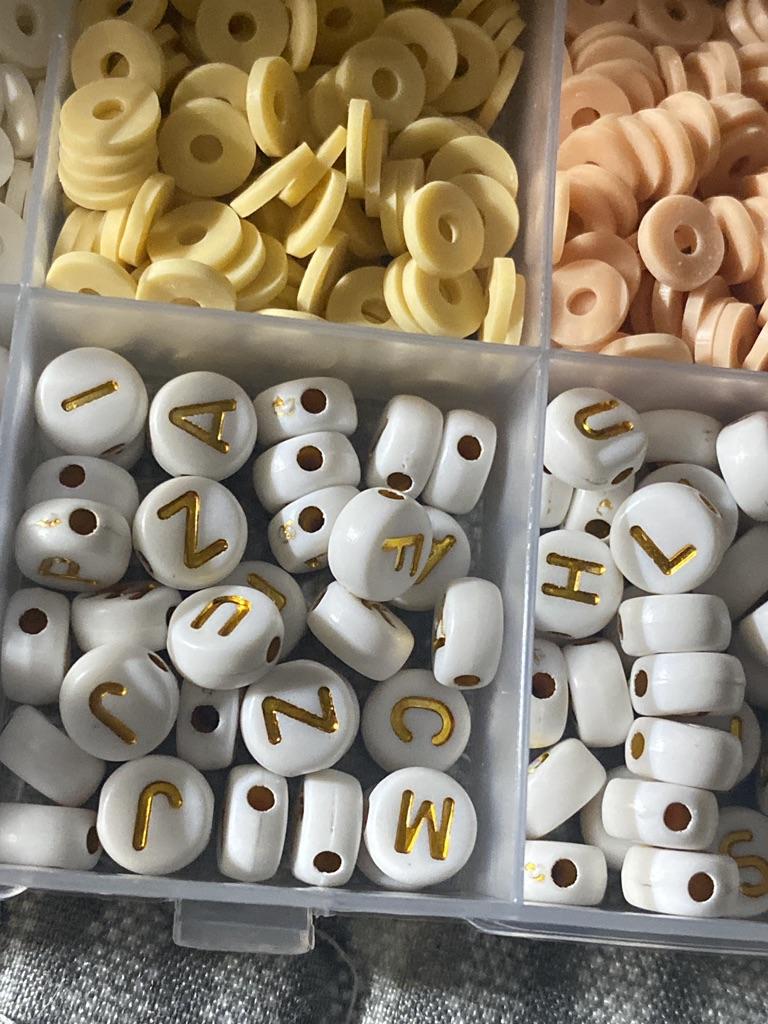 Includes 104 letter beads, 150 gold flake beads, and 60 gold round beads for added variety.