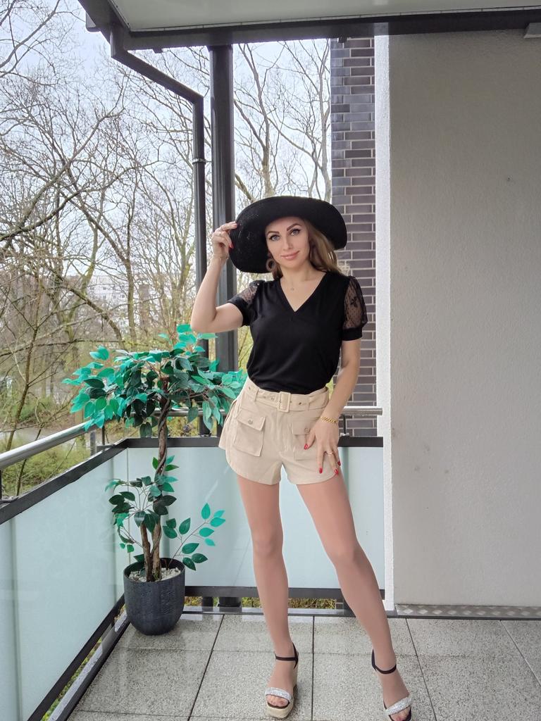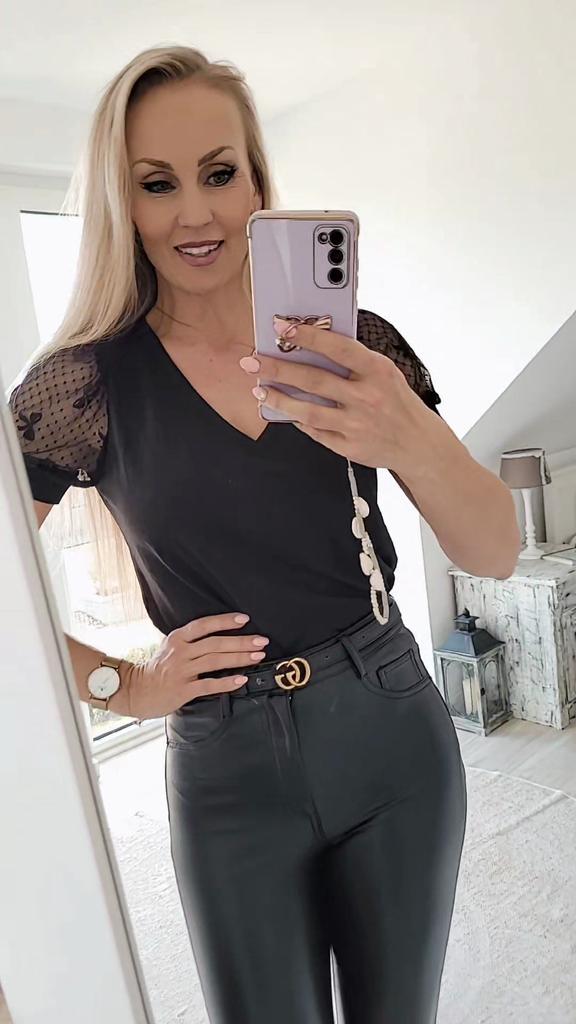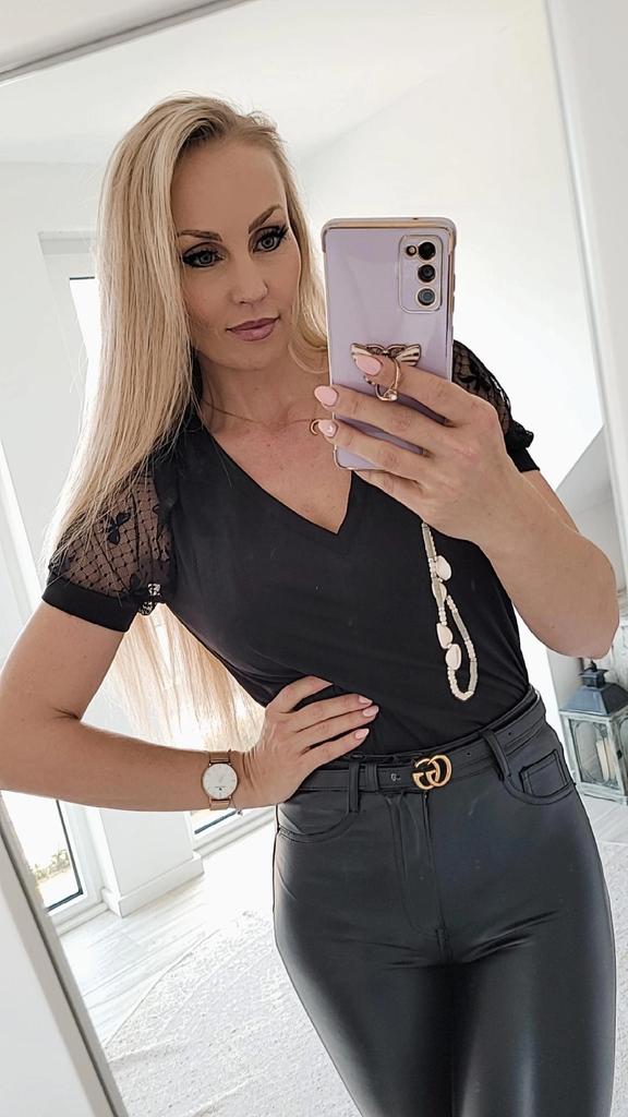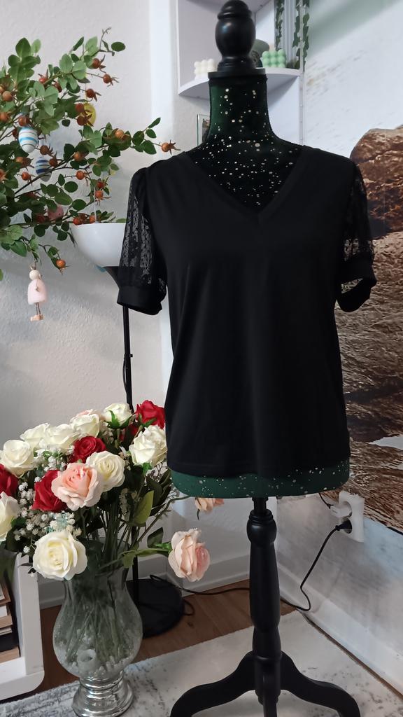 * T-shirt with lace sleeves * 💥𝗟𝗶𝗲𝗳𝗲𝗿𝘇𝗲𝗶𝘁 24 days to Germany 💥𝗟𝗶𝗲𝗳𝗲𝗿𝘂𝗺𝗳𝗮𝗻𝗴 The scope of delivery includes 1 black T-shirt in the appropriate size. This is only available in black in sizes S to XL. I ordered the top in size S. I wear size 36 to 38. I weigh 62 kg over 172 cm. Cup size 75D. The shirt fits me well! It's very stretchy. 💥𝗤𝘂𝗮𝗹𝗶𝘁ä𝘁 The top is opaque. I like the V-neck because it looks a bit more feminine. The top has a nice, slightly tailored fit. I particularly like the lace-look sleeves with a bow motif. For material composition : 100% Polyester 💥𝗙𝗮𝘇𝗶𝘁 Pretty t-shirt with lace sleeves as an eye-catcher that has a good fit. I would recommend ordering the t-shirt one size smaller as it runs slightly larger.