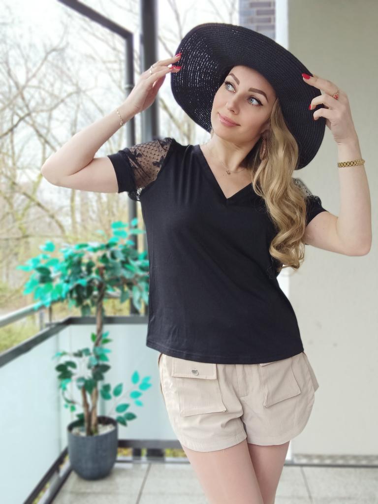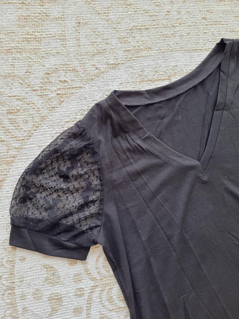 Beautiful short sleeve t-shirt with lace sleeves 👌 Delivery time ✈️✈️🛩: 33 days to Germany. The delivery was delayed, but I received a discount as an apology. ♻️Scope of delivery: The delivery includes a beautiful T-shirt in the appropriate size. The product is only available in this color (black). It is available in sizes S to XL. I ordered the product in size S and it fits me perfectly and the color is exactly as shown. 🤗🤗🤗👍👕 I normally wear dress size 36 (S). I weigh 55kg and am 167cm tall. 👍👍💥💣. 🌞Quality ♻️: Nice soft fabric, comfortable on the skin, even though it is made of polyester. The top is opaque, which I think is great. The item has a V-neck and lace sleeves, which looks very seductive. 👍👍👍👌. I like this design. It looks great and is easy to combine. Material composition: 95% Polyester, 5% Spandex. I think the product 👕 is beautiful 🔝🔝🔝🔝🔝 ✳️Summary ✳️: A beautiful T-shirt👕 that you can order in your normal size.. You can also order a size smaller, it will also fit. I would be happy to recommend the product. 5 stars. 🌟! Thank you Joom and the seller!☀️