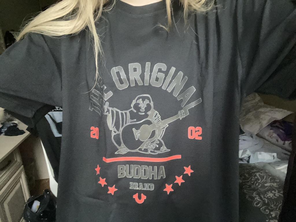 True Religion Jeans Logo Tee Crew Horseshoe Flocked Buddha Graphic Black Unisex T-Shirt