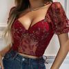 Casual V Neck Shirt Mesh Short Sleeve Crop Top Women Embroidered ButterflyT-shirt Backless Tank Top Slim Female Crop Top Fashion Tee Shirt Y2k