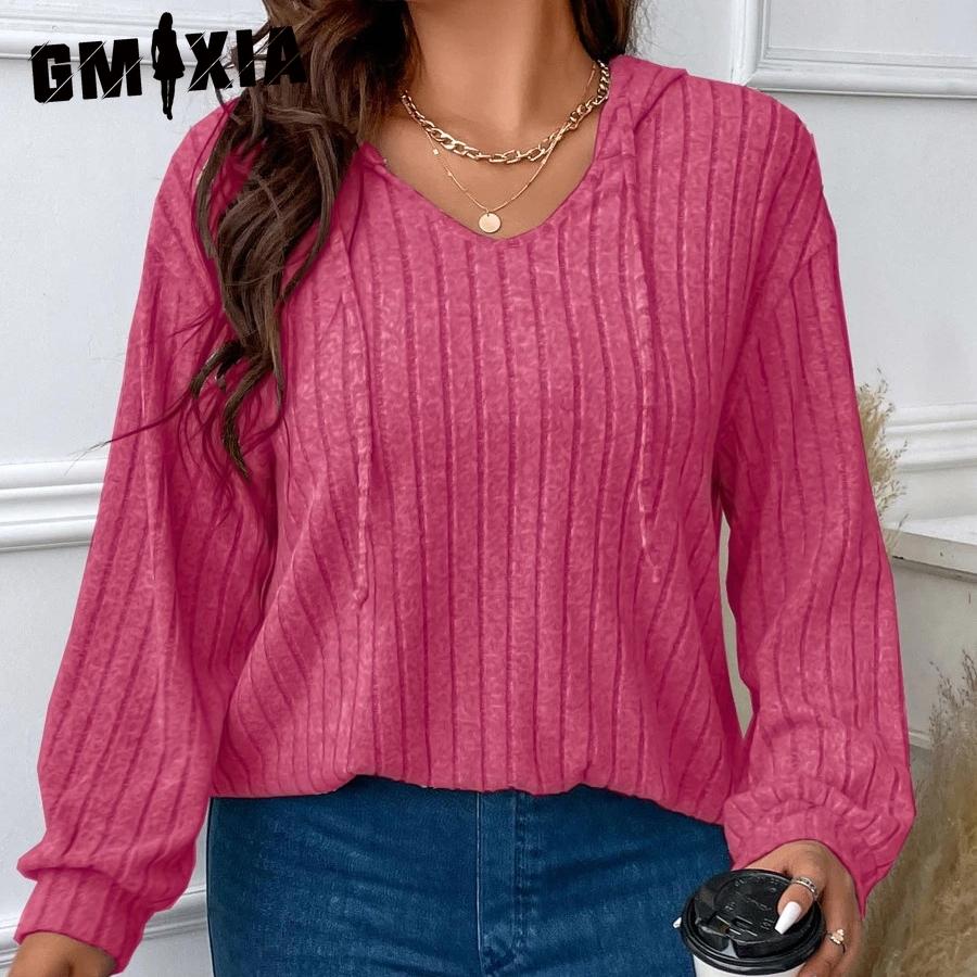 GMXIA Women's Fashion Casual Hooded Pit Stripe Fur T-shirt Solid Color Print Autumn Winter Long Sleeve V-Neck Loose Sweaters — buy online with free worldwide shipping!